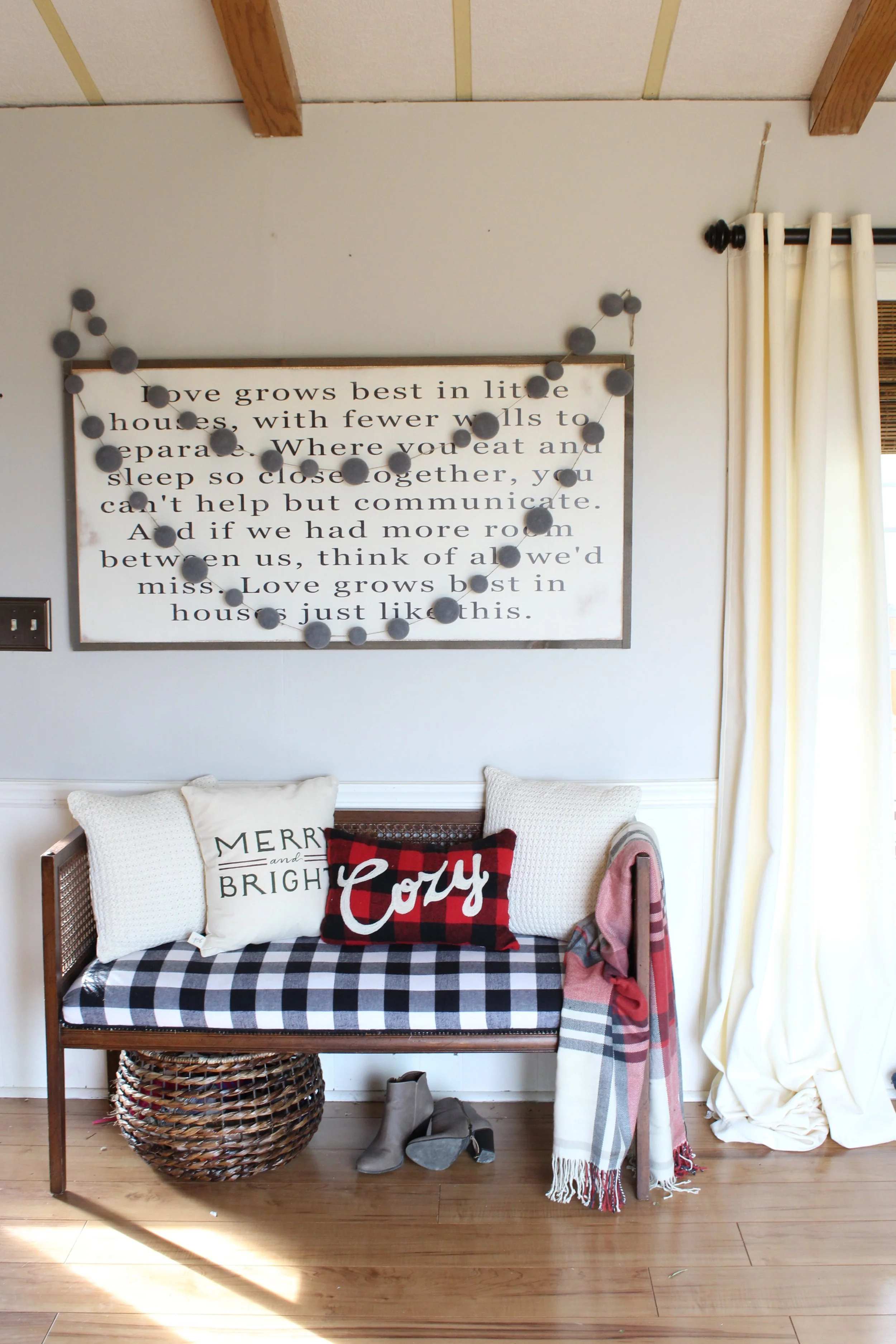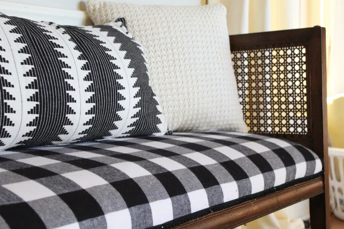 With the upcoming holidays, I knew it was time for a change. I was so inspired by Caitlin Wilson's navy burnside buffalo check fabric but I could not afford that beautiful fabric. I also wanted it in black. So, I made a trip to my local Hobby Lobby and I found not only black buffalo check fabric in the right scale, it was on sale!!