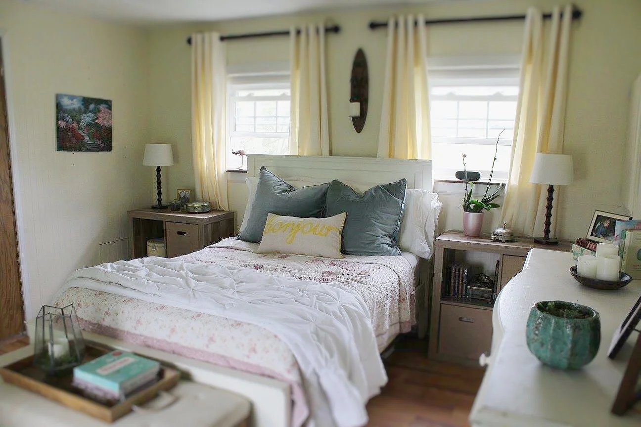 My budget was zero dollars so I shopped around the house for "new" decor. I added some curtains and switched up the decor.