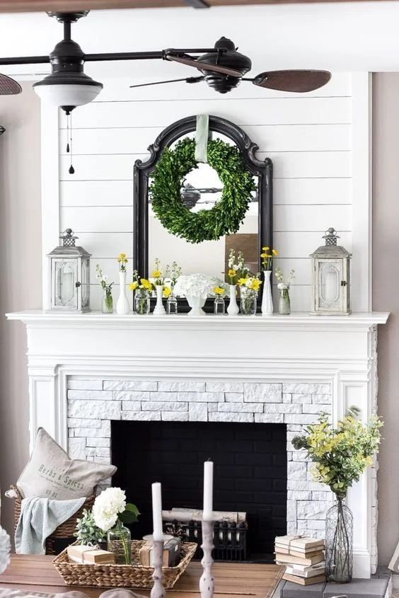 Stacking short logs about halfway up the fireplace will draw attention to your lovely DIY project. Here is another great example of layering pieces on the mantle. The greenery and the short logs complement each other, giving off an earthy, natural vibe.