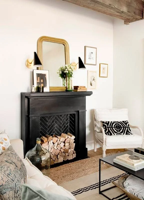 There are multiple ways to go about accessorizing your fireplace. We love adding artwork above the mantle. Do you have a wall-mounted flat screen TV above the fireplace? It’s no big deal because you can still incorporate artwork on top of the mantle. Placing framed photos or prints on top of the mantle, leaning some against the wall will help to give your fireplace some dimension. Layer in greenery and décor for even more interest.