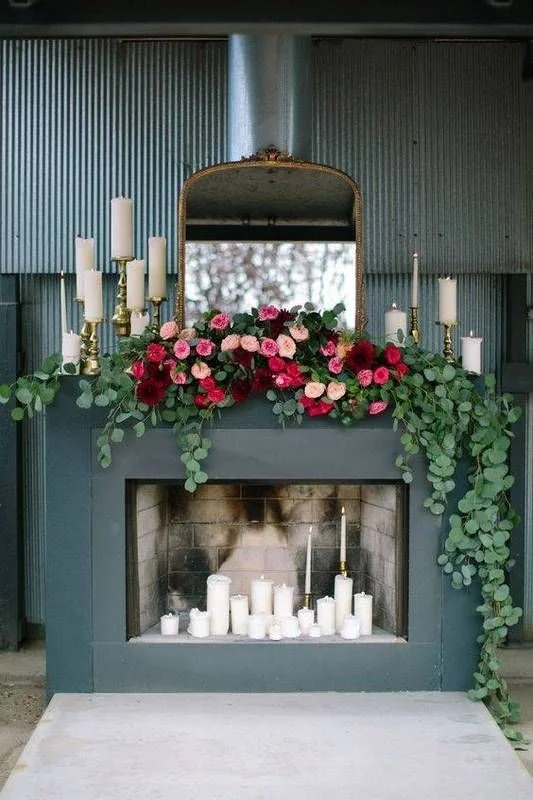 Add candles in various heights to create visual interest on your mantle. The cascading greenery and flowers give this image above an enchanted garden feel. We love this look for weddings and other special occasions.