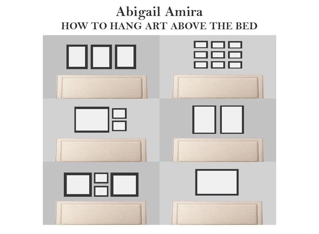 We also created this handy guide on how to hang your art pieces above your bed. You can play around with theses layouts to find one that works best for your bedroom. We would love to see photos of your bedroom using our guide! Use the hashtag #abigailamira and be sure to tag us @abigailamirahome so we can see it!