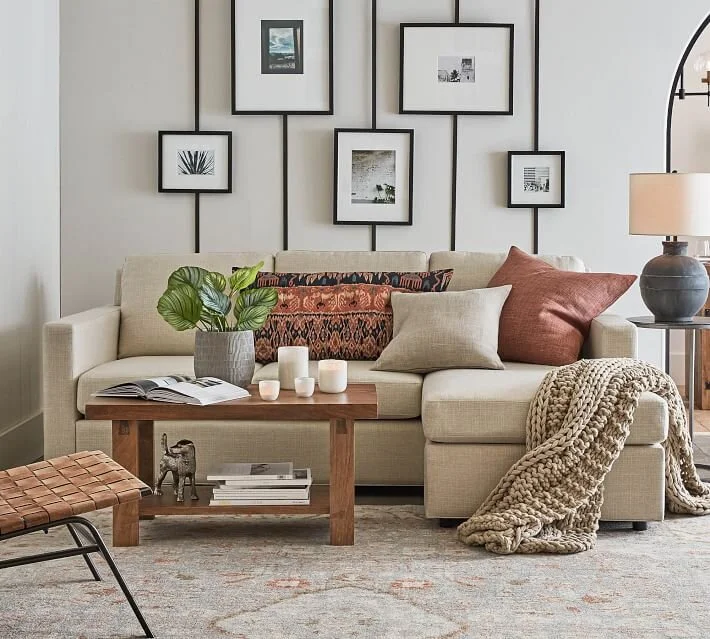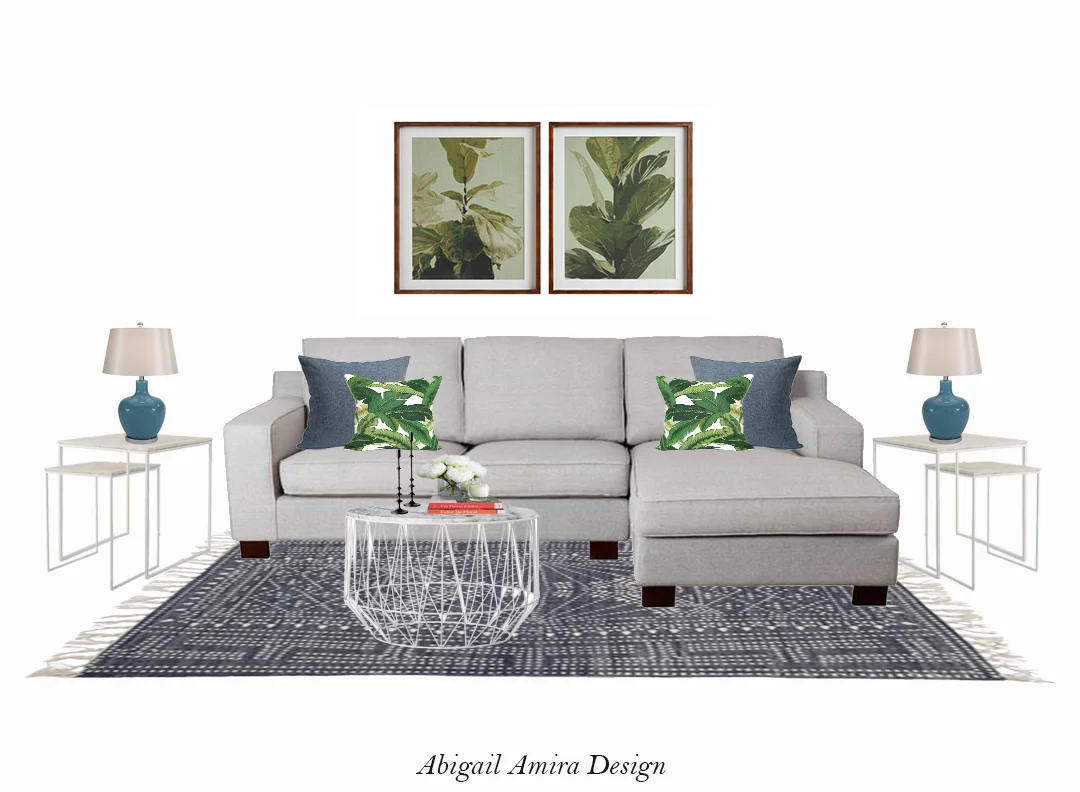 Placement of your coffee table depends on the sofa in your space. Here at Abigail Amira, we like to place our round coffee tables off-centered for a casual look. This looks best with a sofa that has a chaise but works with traditional sofas too!