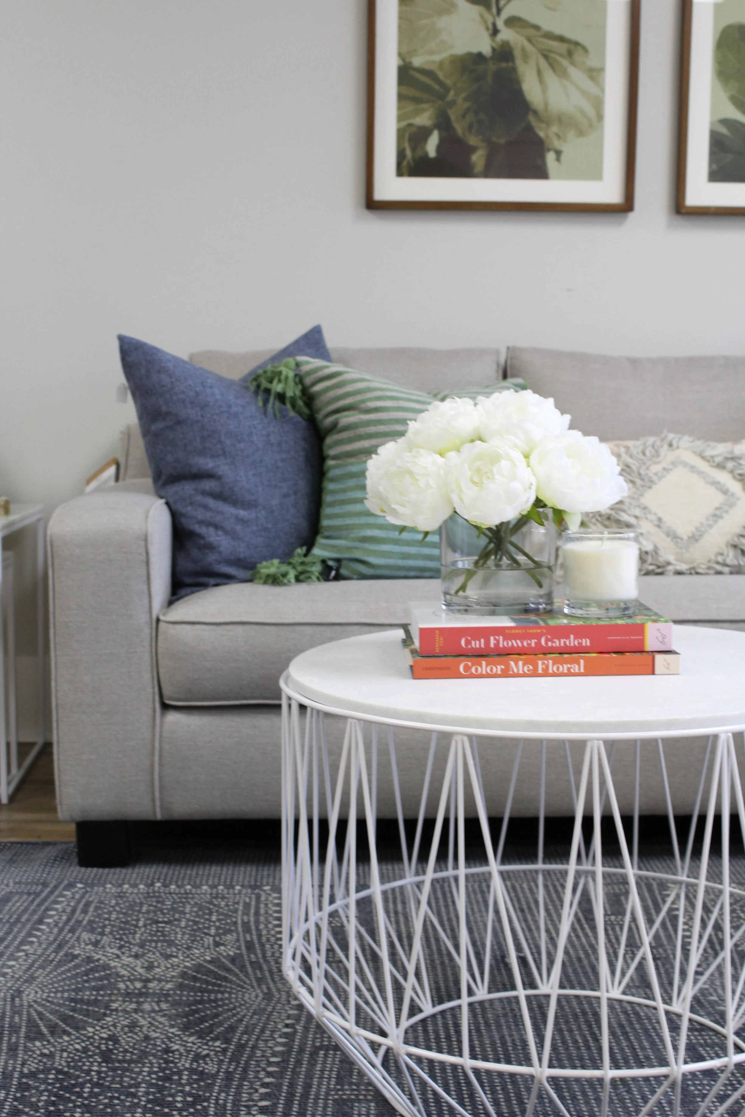 We have been getting lots of questions about round coffee tables. How do I style them? Should I place them centered with my sofa? What sofa would you pair a round coffee table with? Today, I will answer these questions and show you easy ways to style your coffee table using our new Round Marble Coffee Table.