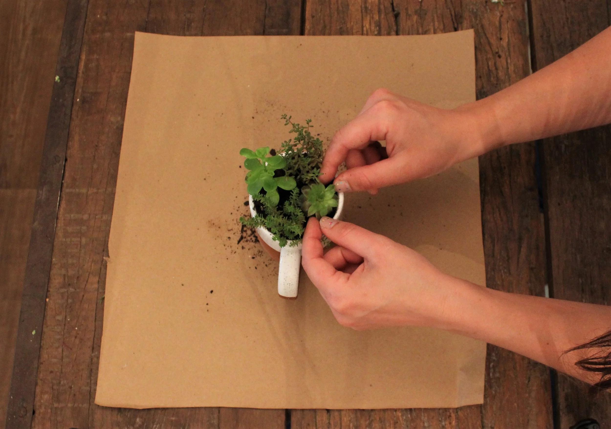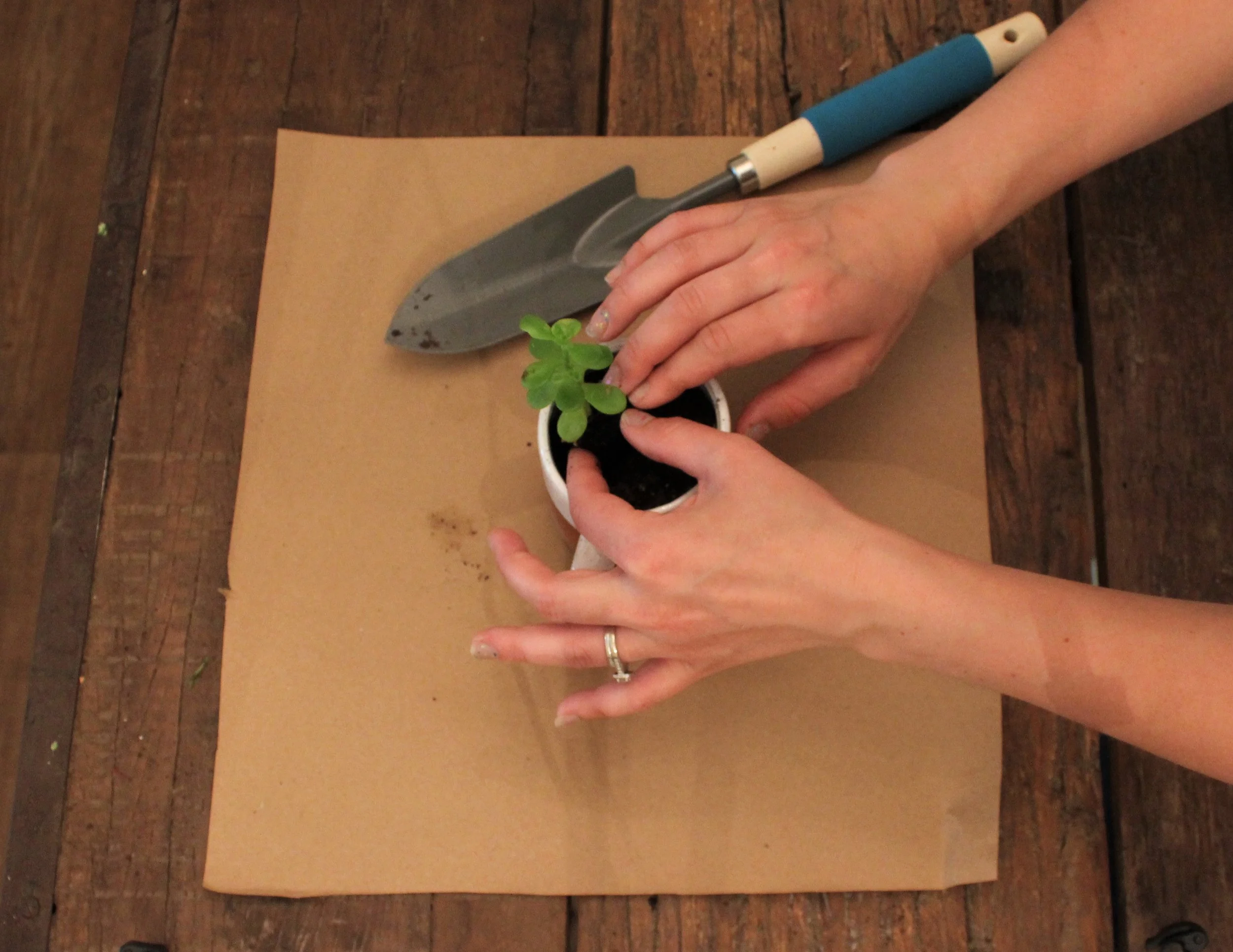 After that, add your statement succulent or a rosette-style succulent to the #4 spot. Fill in any holes with additional soil.