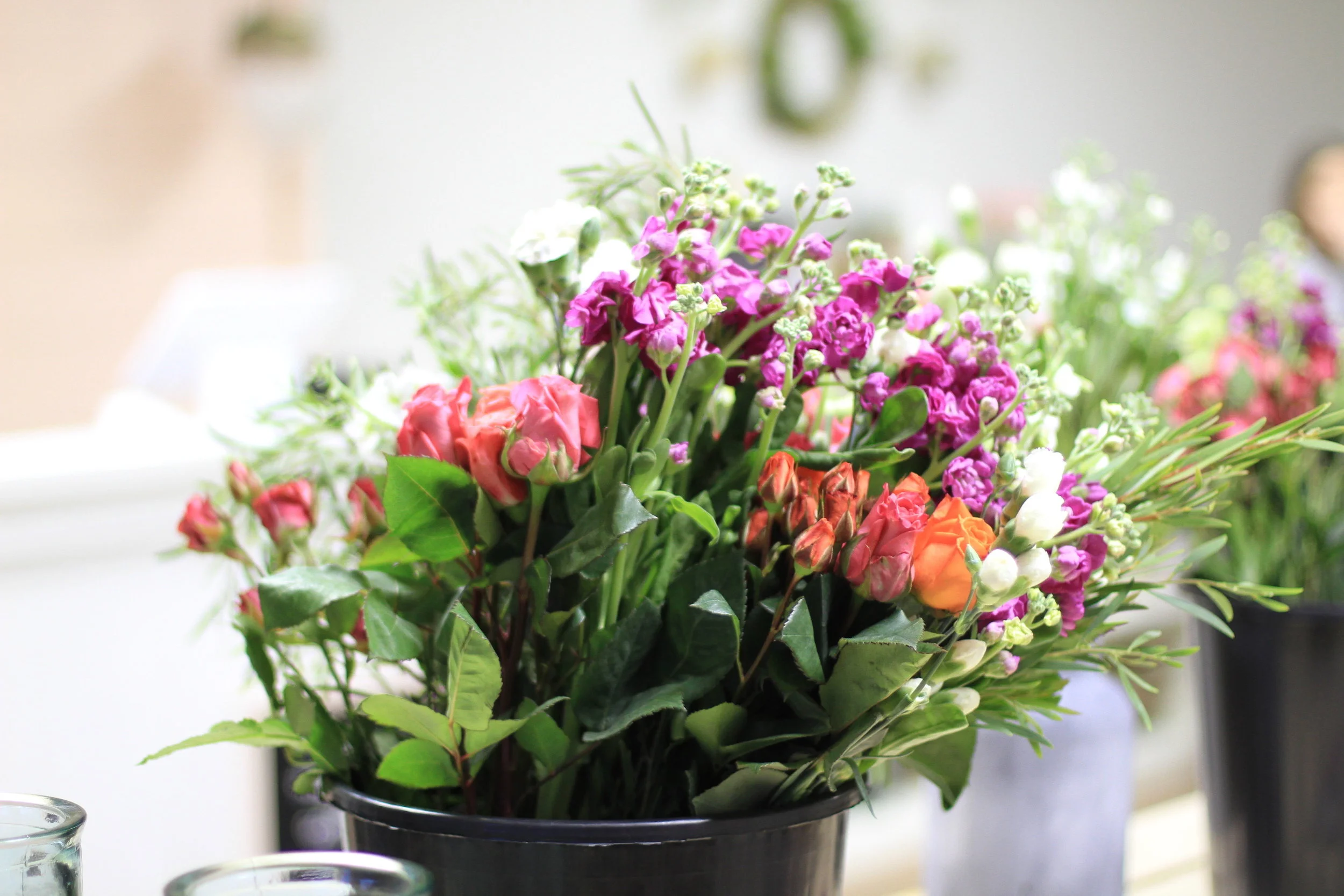 This time we offered three different vase options and we used Willow Eucalyptus, Roses, Stock, Spray Roses and Carnations. We sourced all these colorful blooms for this arrangement from Trader Joes!