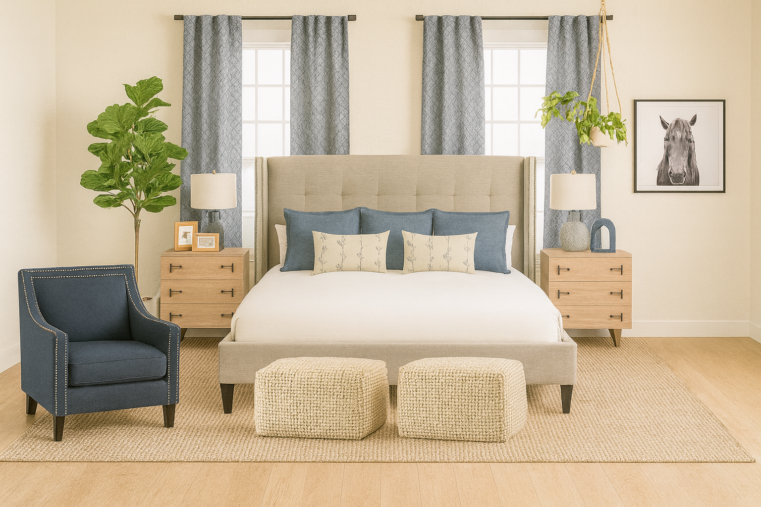 Now that we have a strong base let’s start adding in the accents! I choose to add two ottomans instead of the traditional bench at the end of the bed.