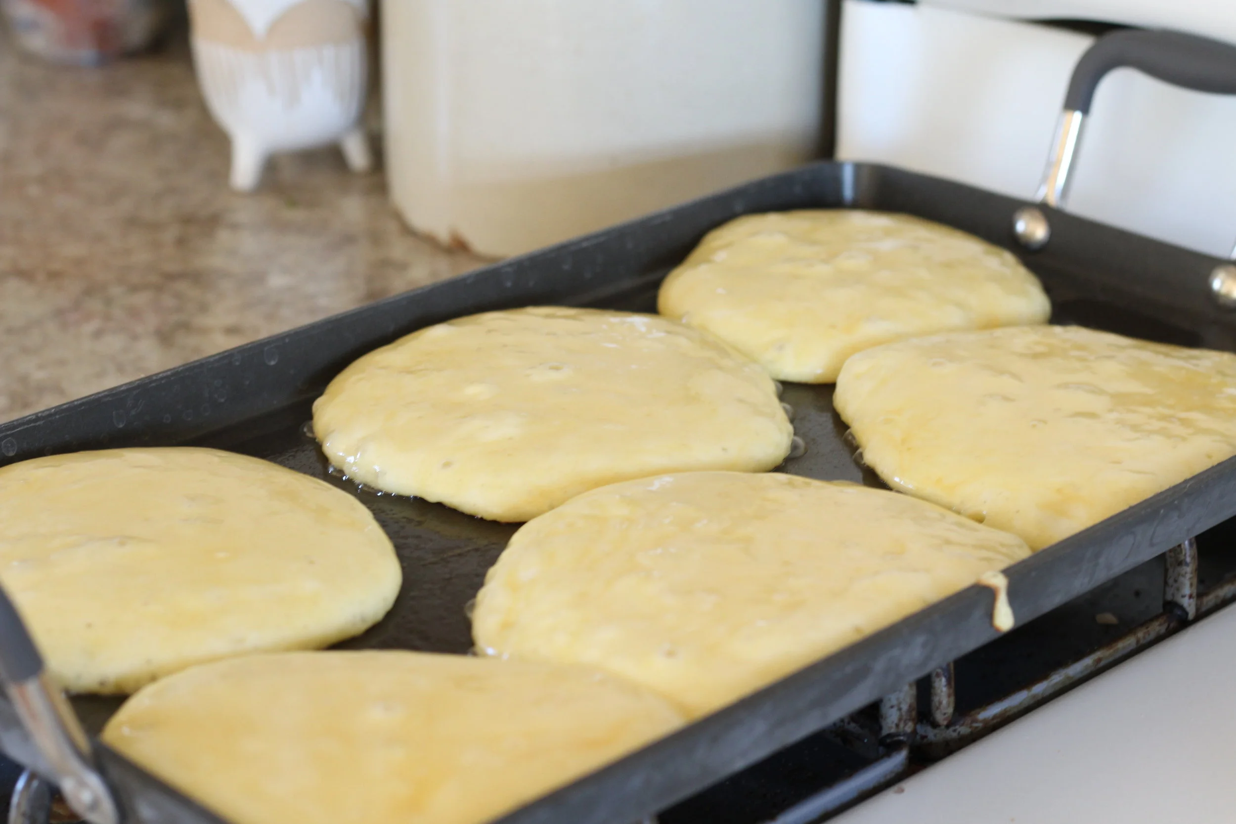Cook on one side until bubbles form, then flip them over and cook for another minute or so. Don’t worry about any unevenness, they will settle down for a prefect pancake.