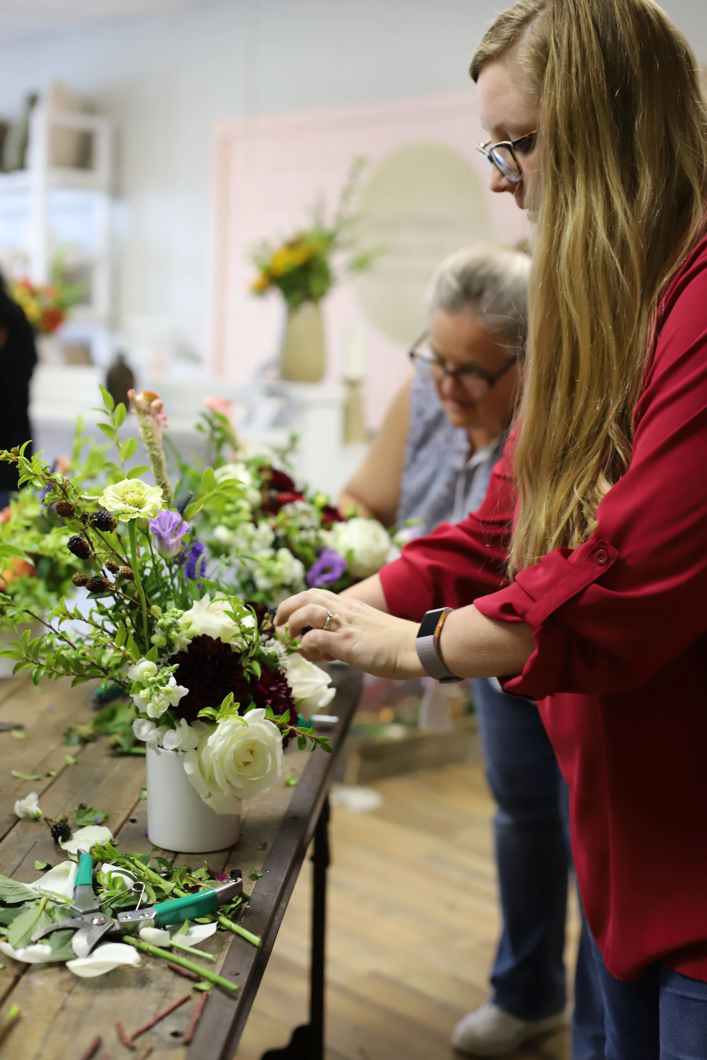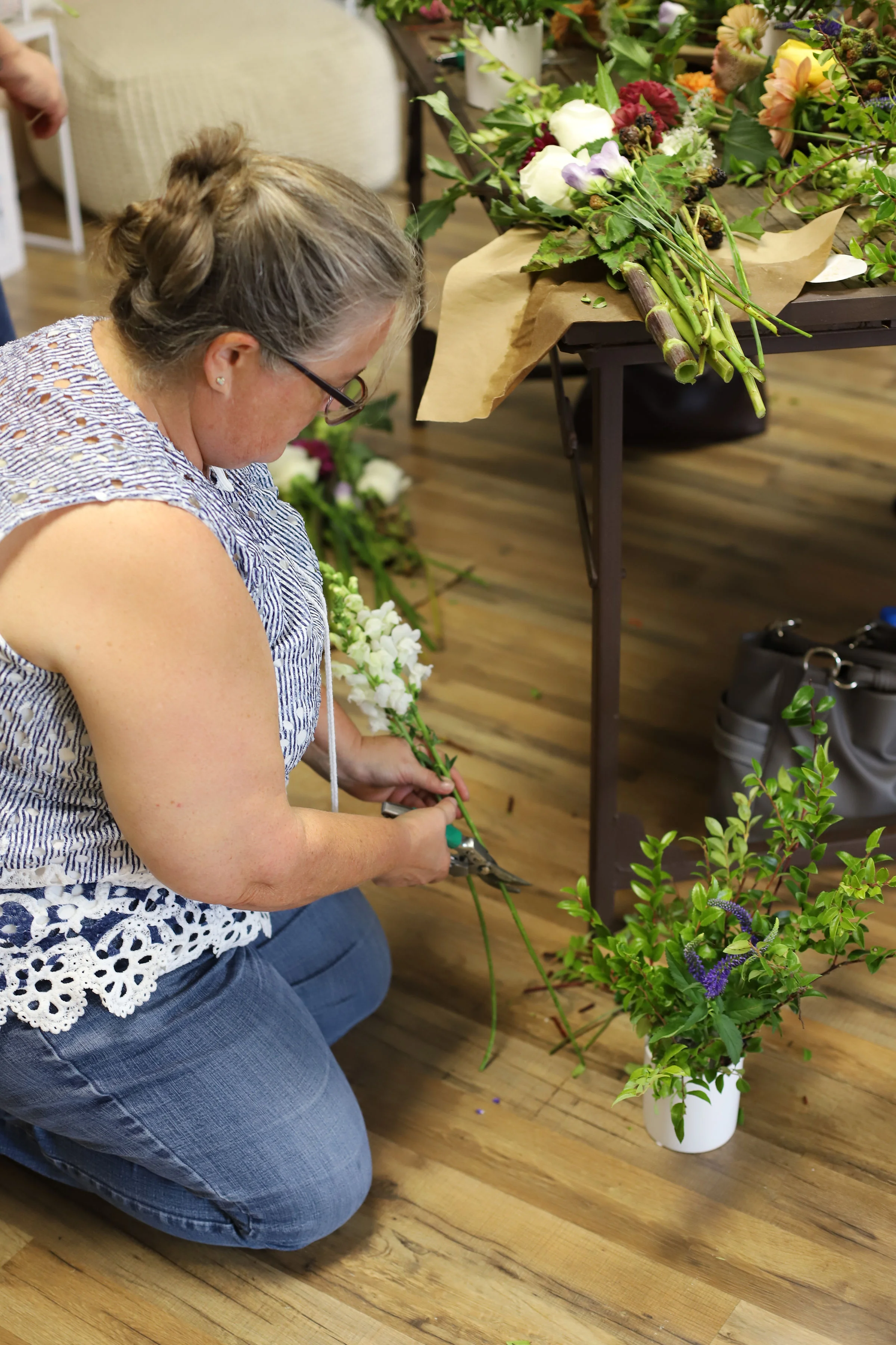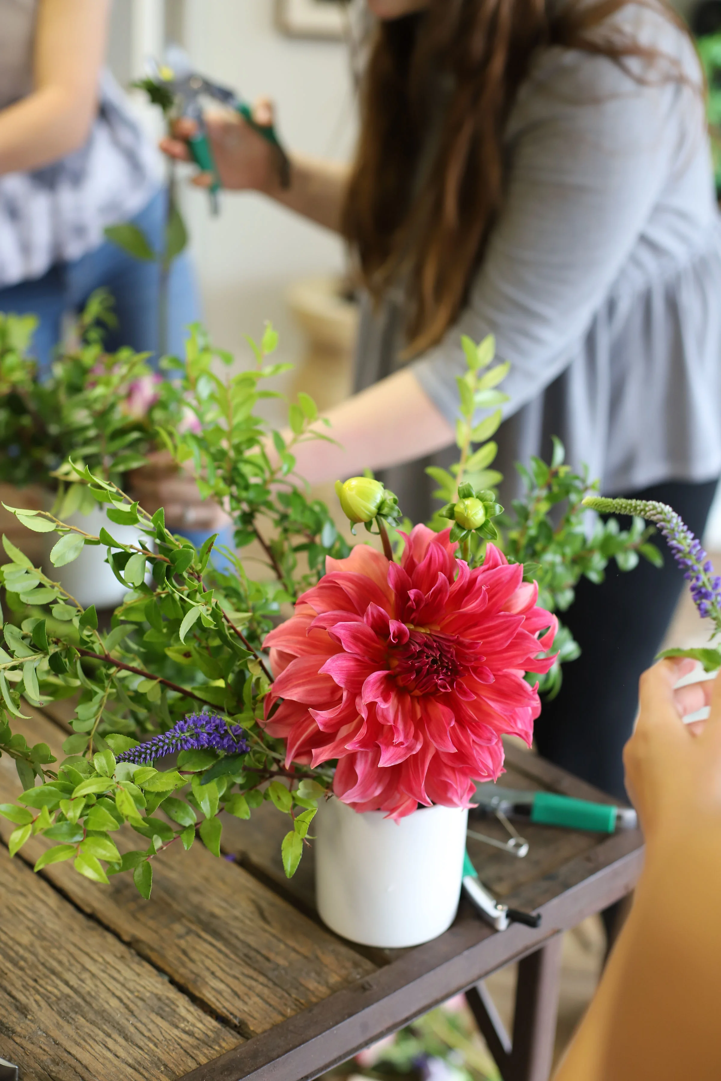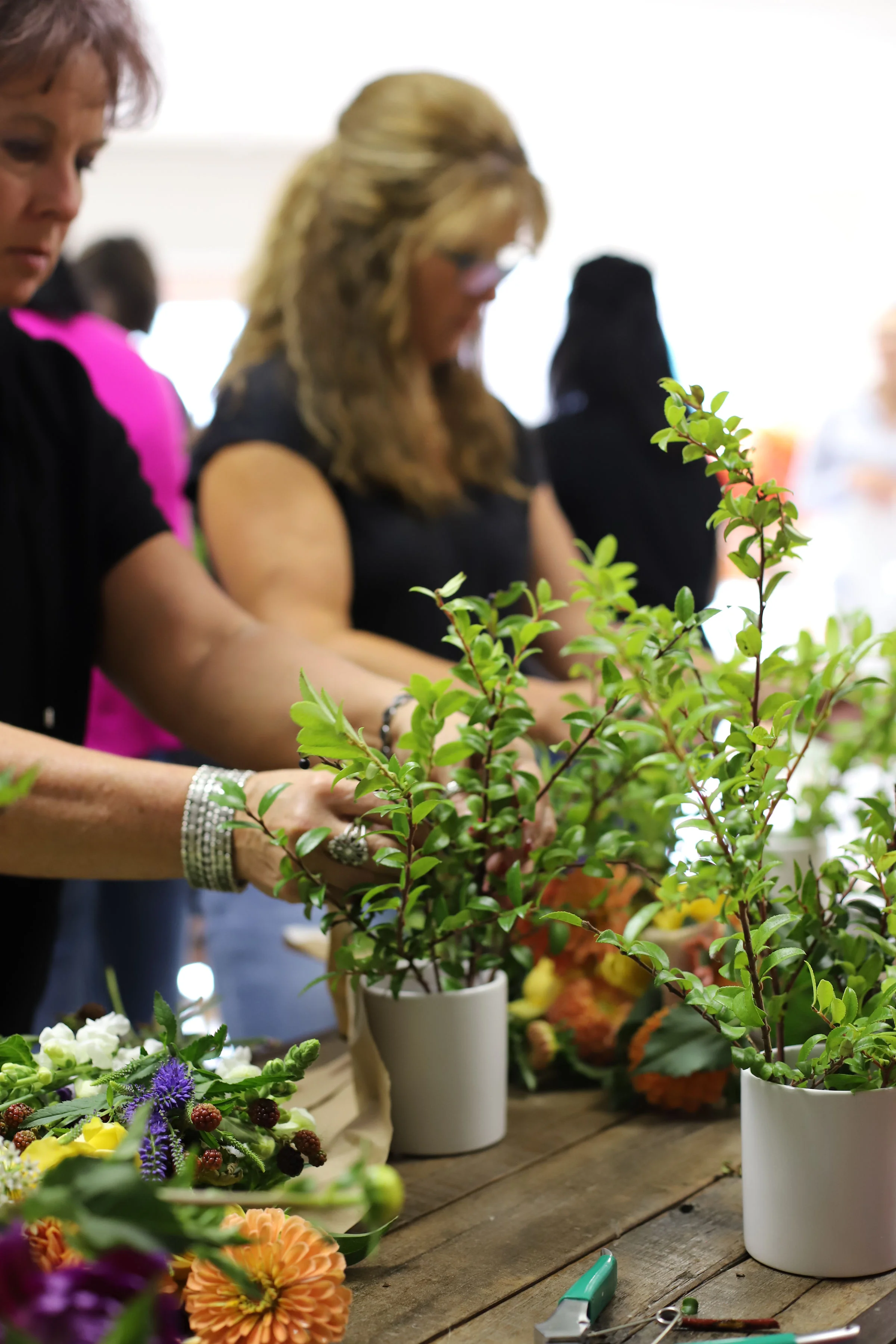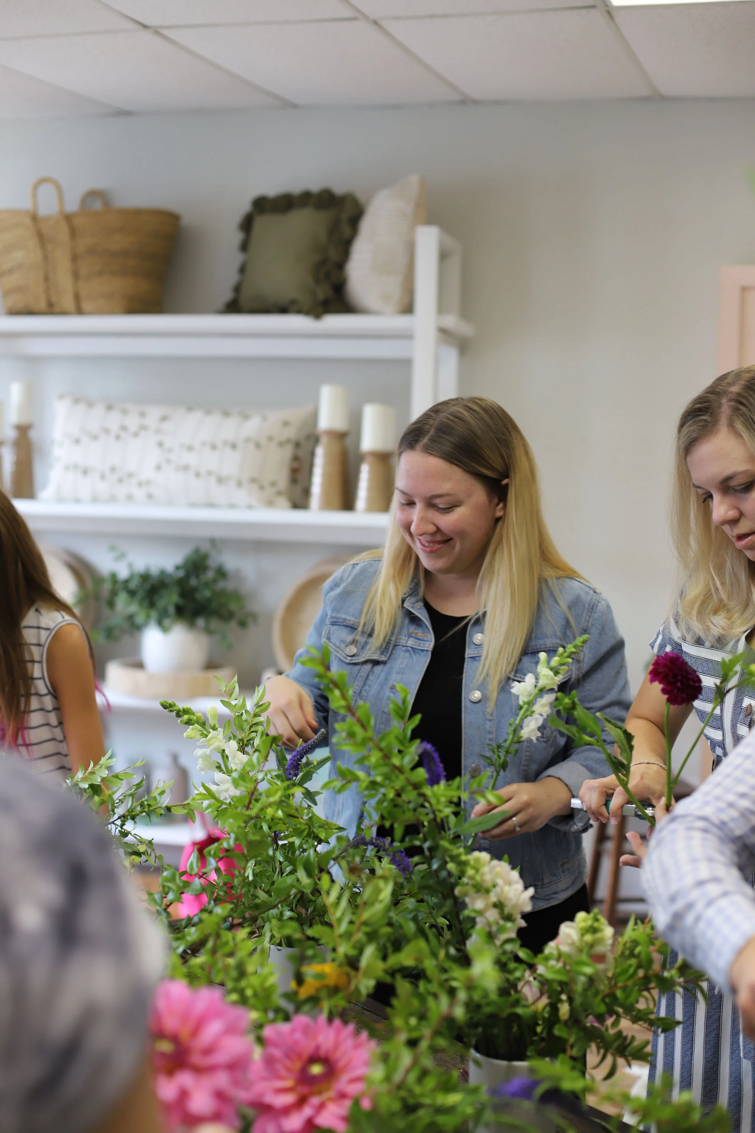 IN AUGUST, THE SHOP WAS FILLED WITH BEAUTIFUL LOCALLY SOURCED DAHLIAS, ZINNIAS, ALLIUM, SNAPDRAGONS, VERONICA AND CELOSIA. WE HAD SUCH A FUN NIGHT CREATING A GORGEOUS FLORAL CENTERPIECE!