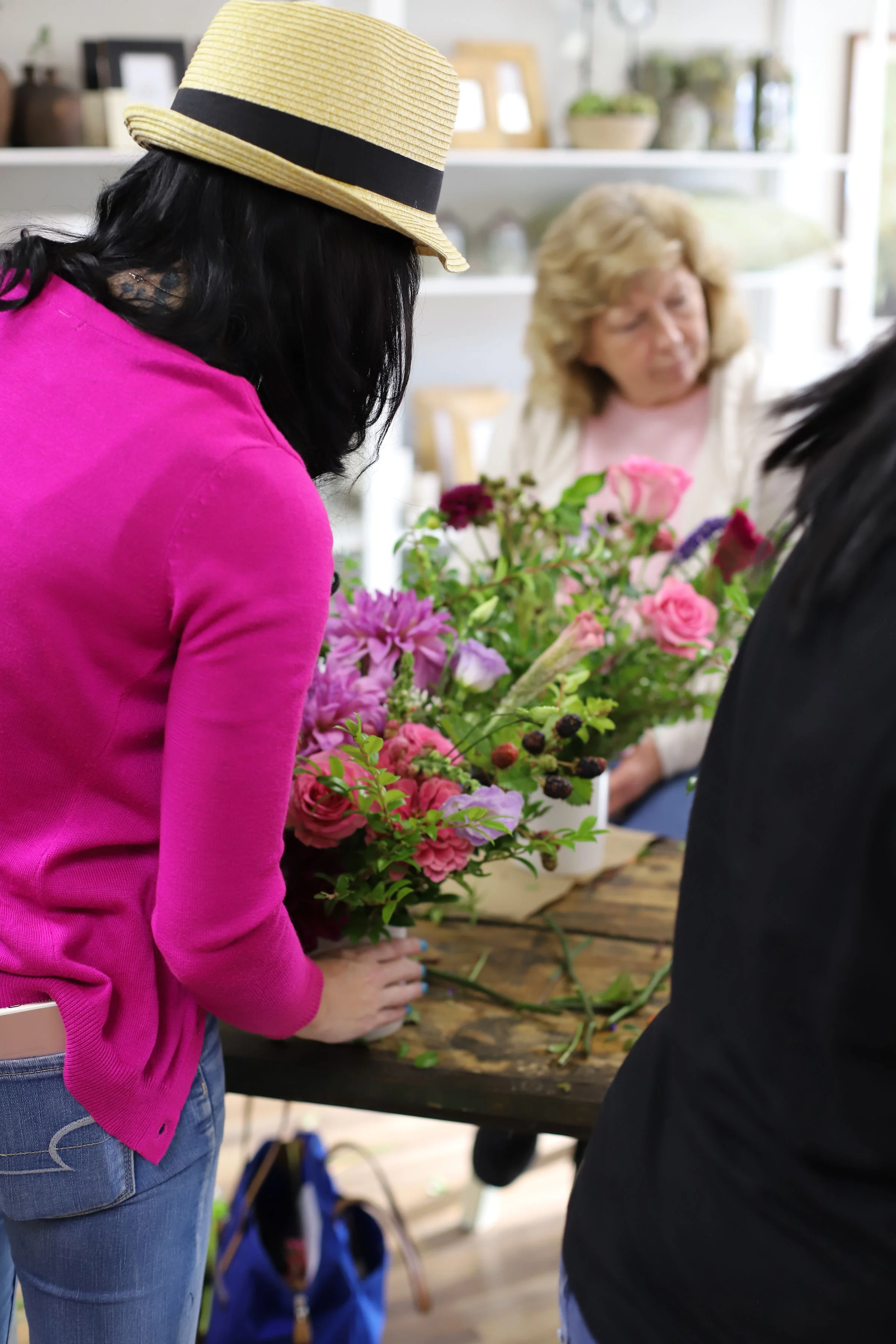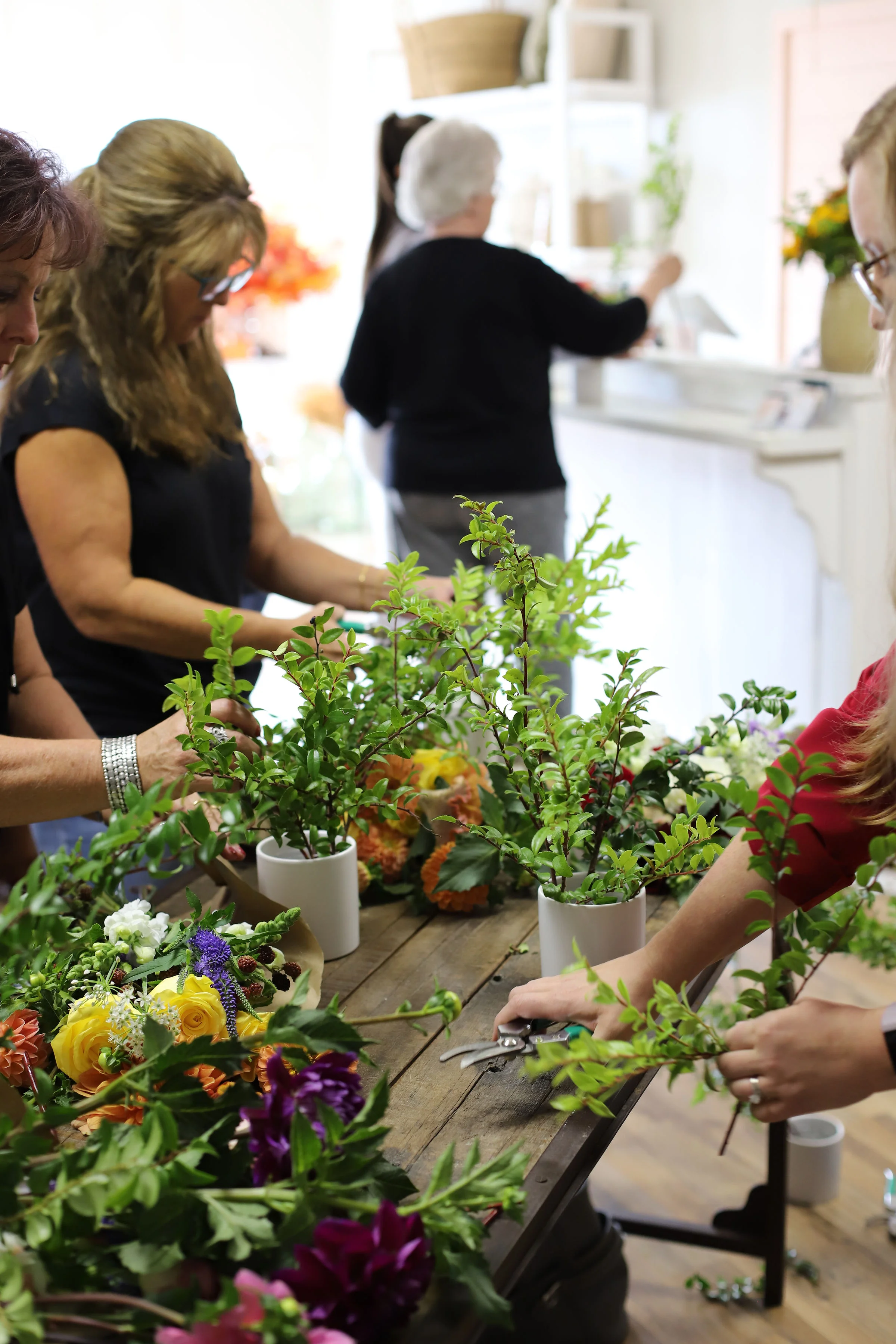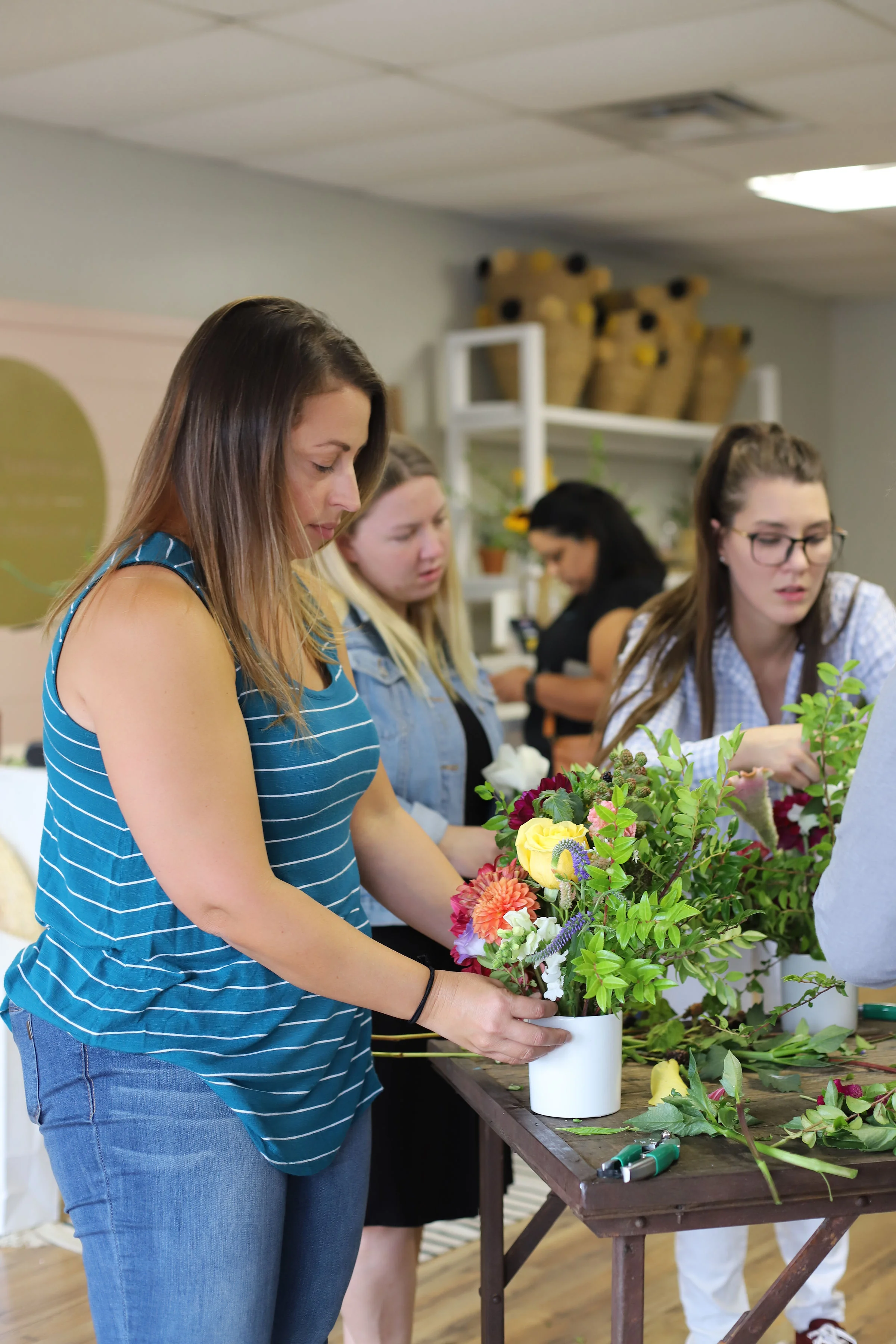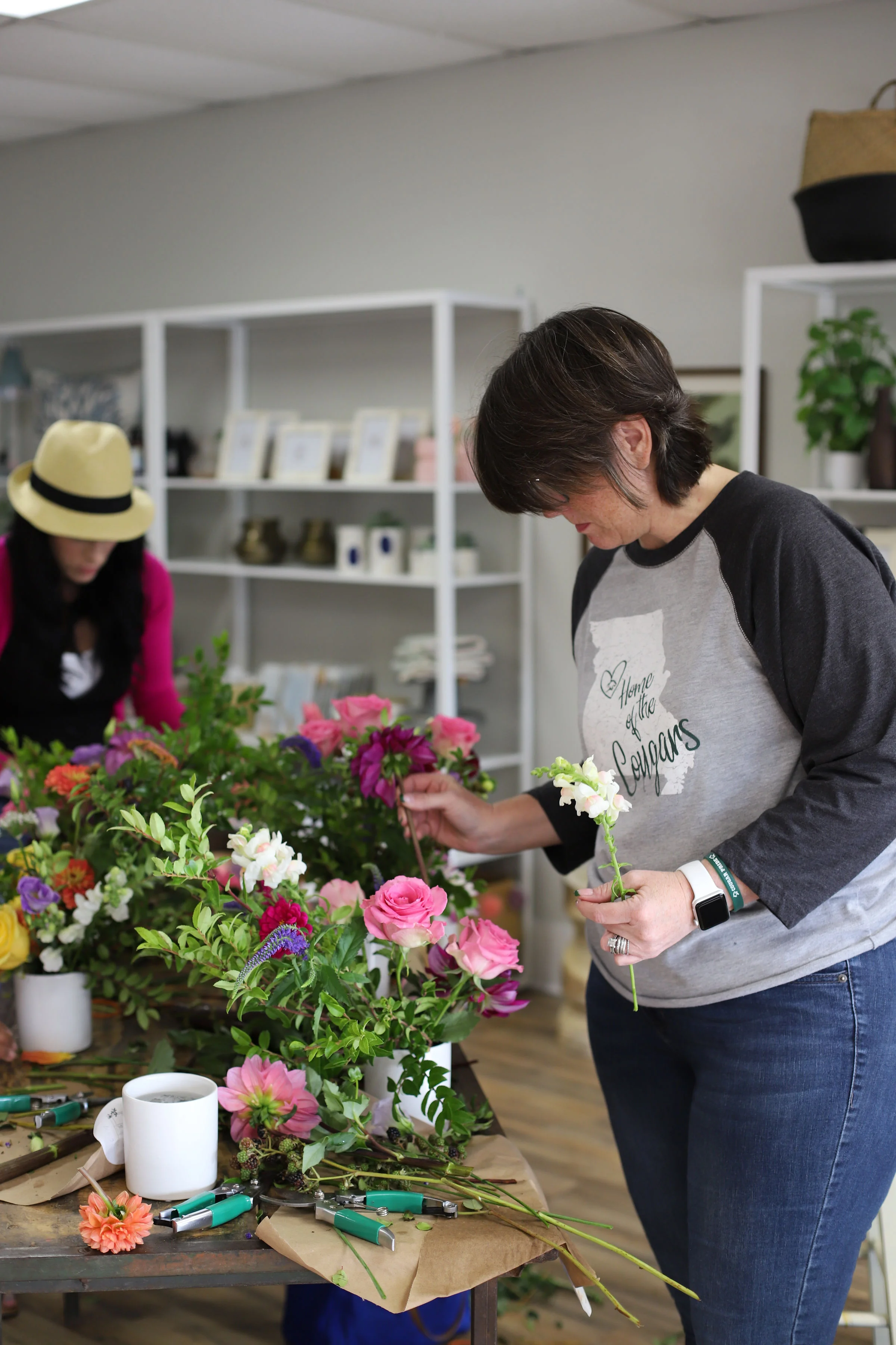IN AUGUST, THE SHOP WAS FILLED WITH BEAUTIFUL LOCALLY SOURCED DAHLIAS, ZINNIAS, ALLIUM, SNAPDRAGONS, VERONICA AND CELOSIA. WE HAD SUCH A FUN NIGHT CREATING A GORGEOUS FLORAL CENTERPIECE!