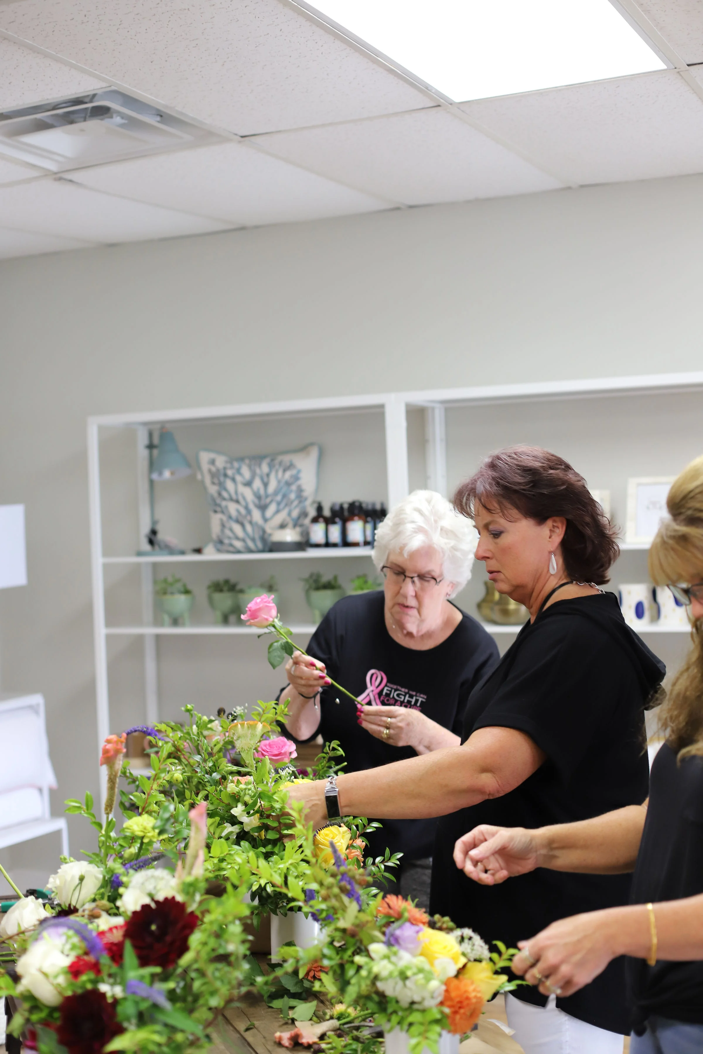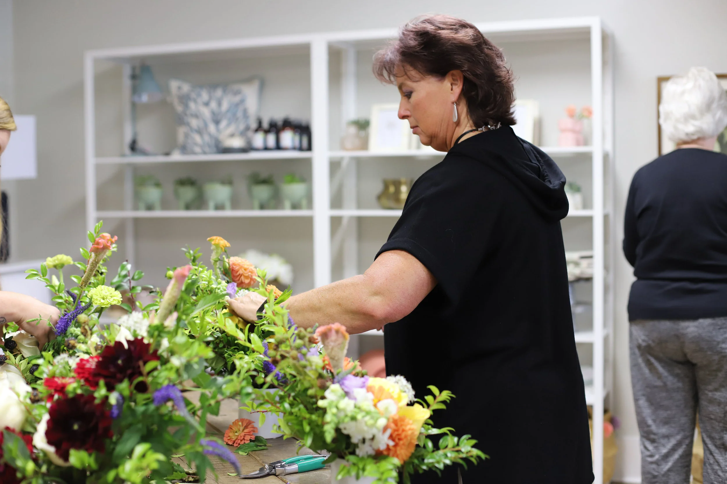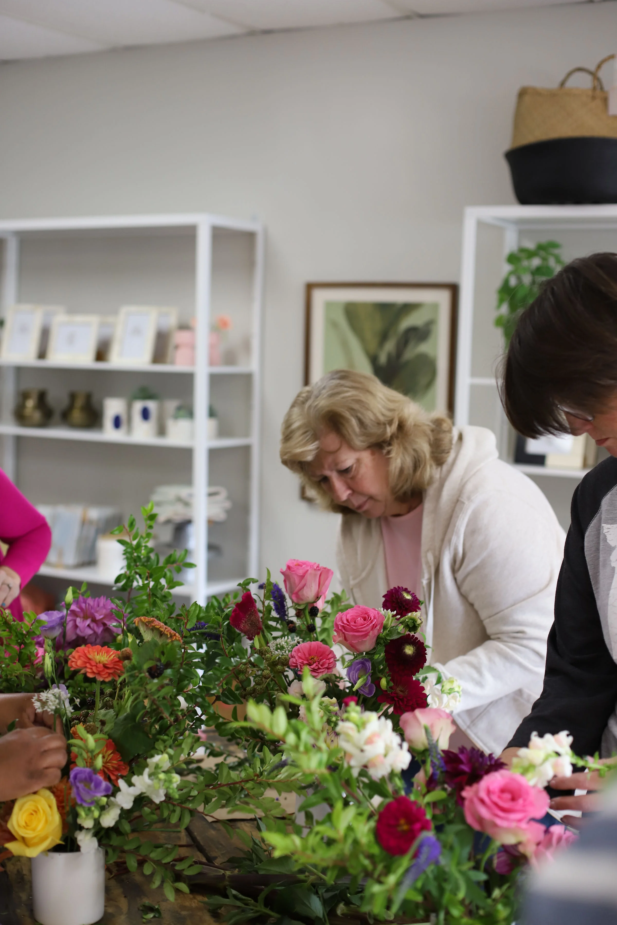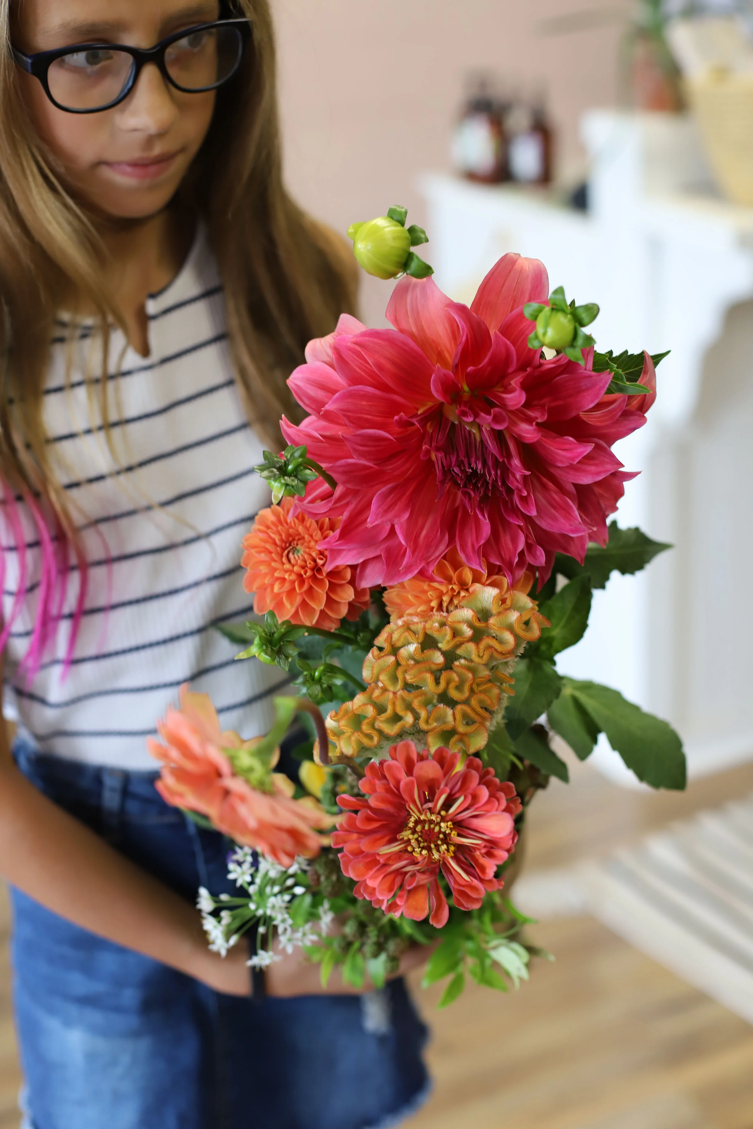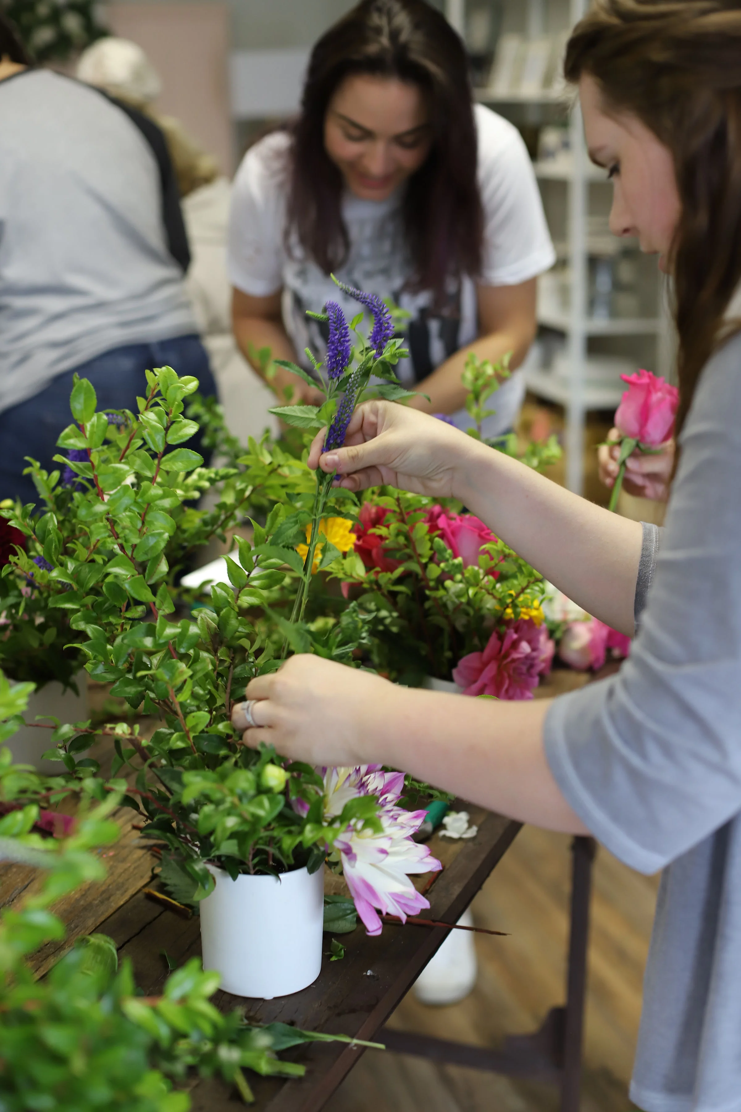 IN AUGUST, THE SHOP WAS FILLED WITH BEAUTIFUL LOCALLY SOURCED DAHLIAS, ZINNIAS, ALLIUM, SNAPDRAGONS, VERONICA AND CELOSIA. WE HAD SUCH A FUN NIGHT CREATING A GORGEOUS FLORAL CENTERPIECE!
