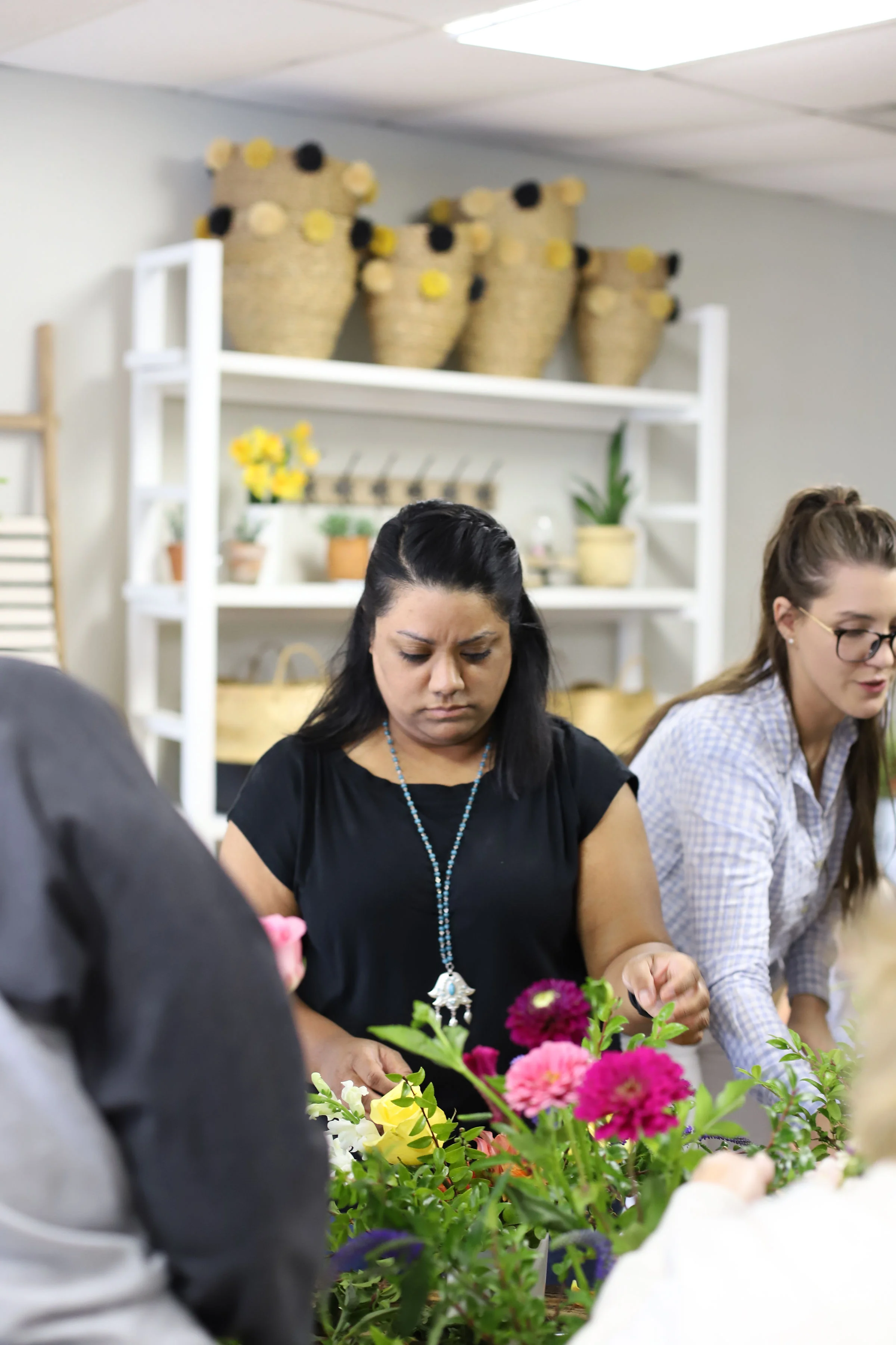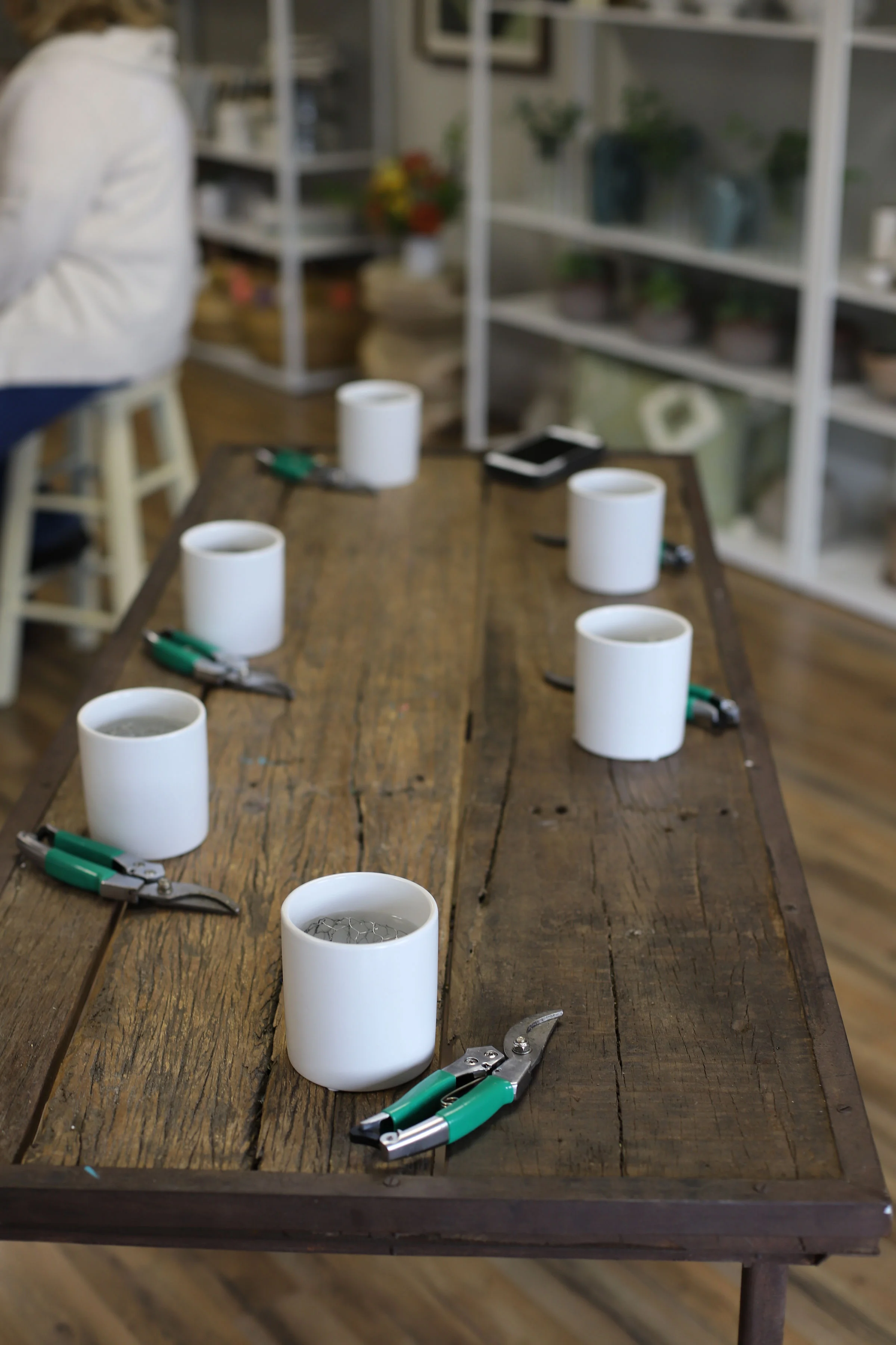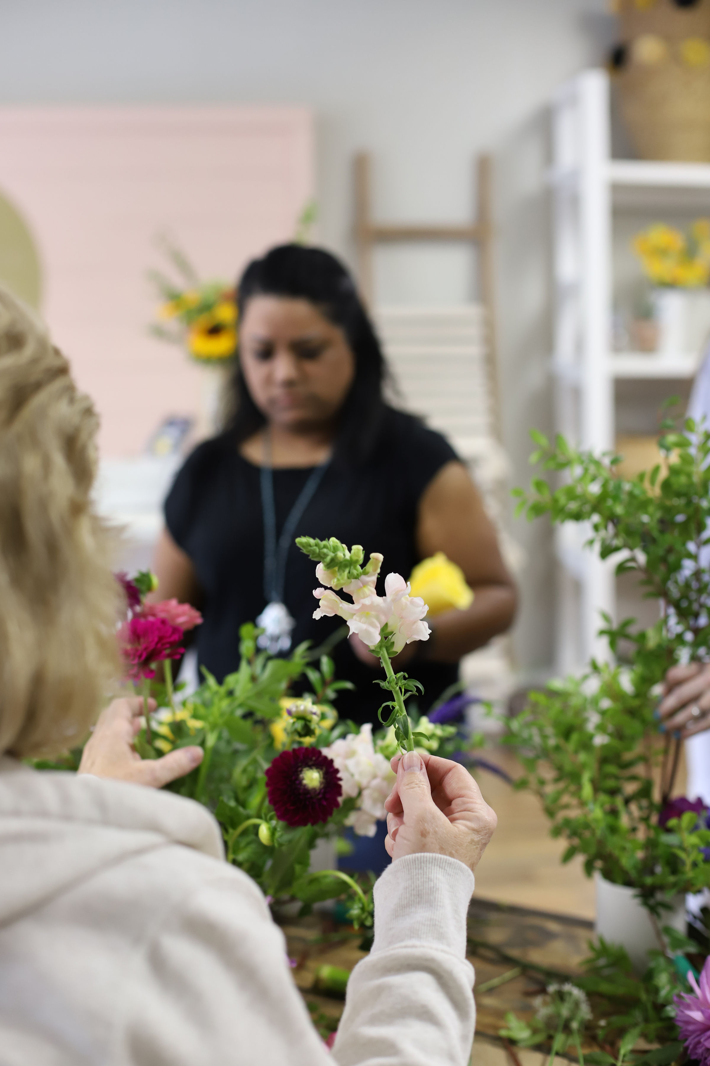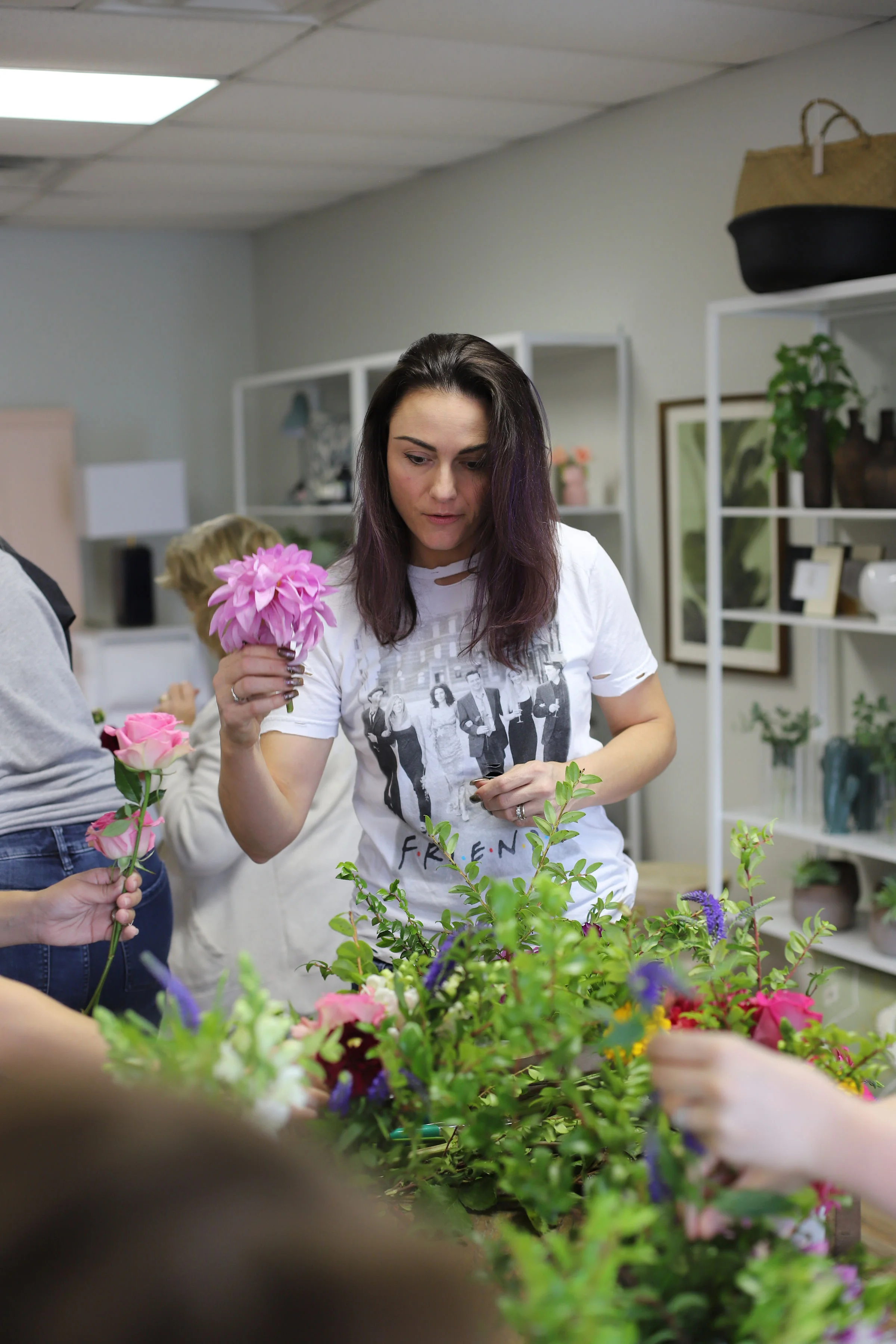 IN AUGUST, THE SHOP WAS FILLED WITH BEAUTIFUL LOCALLY SOURCED DAHLIAS, ZINNIAS, ALLIUM, SNAPDRAGONS, VERONICA AND CELOSIA. WE HAD SUCH A FUN NIGHT CREATING A GORGEOUS FLORAL CENTERPIECE!