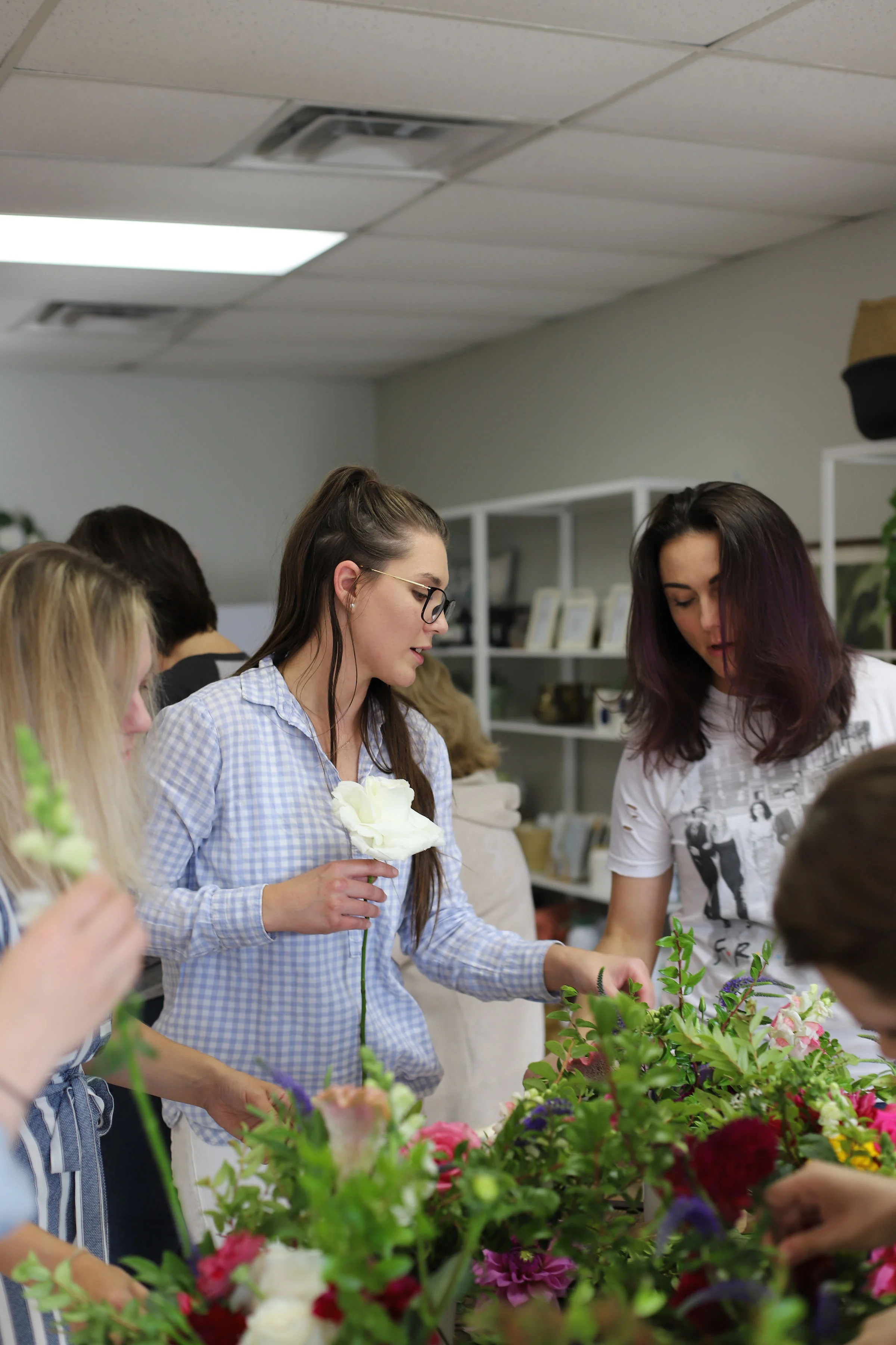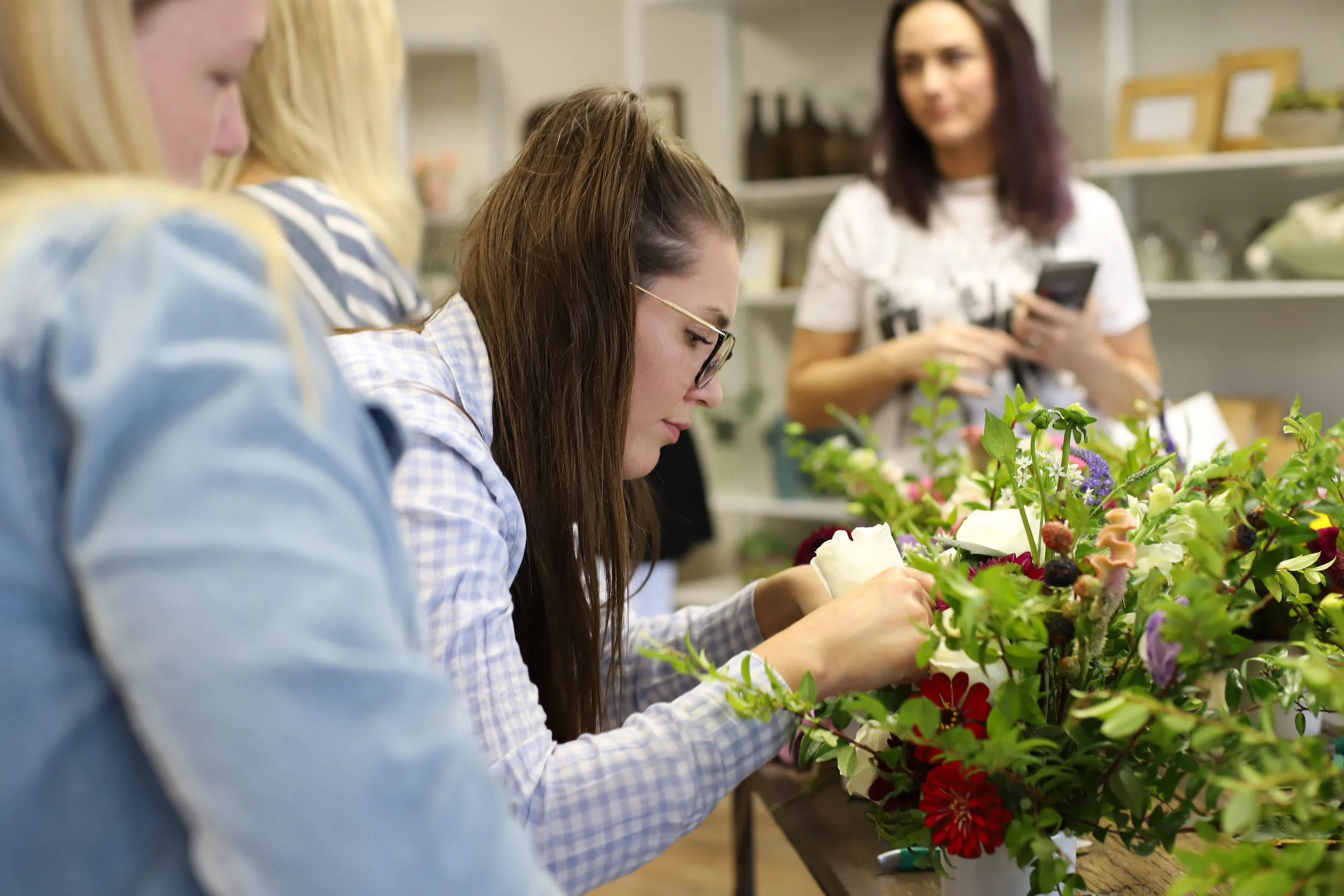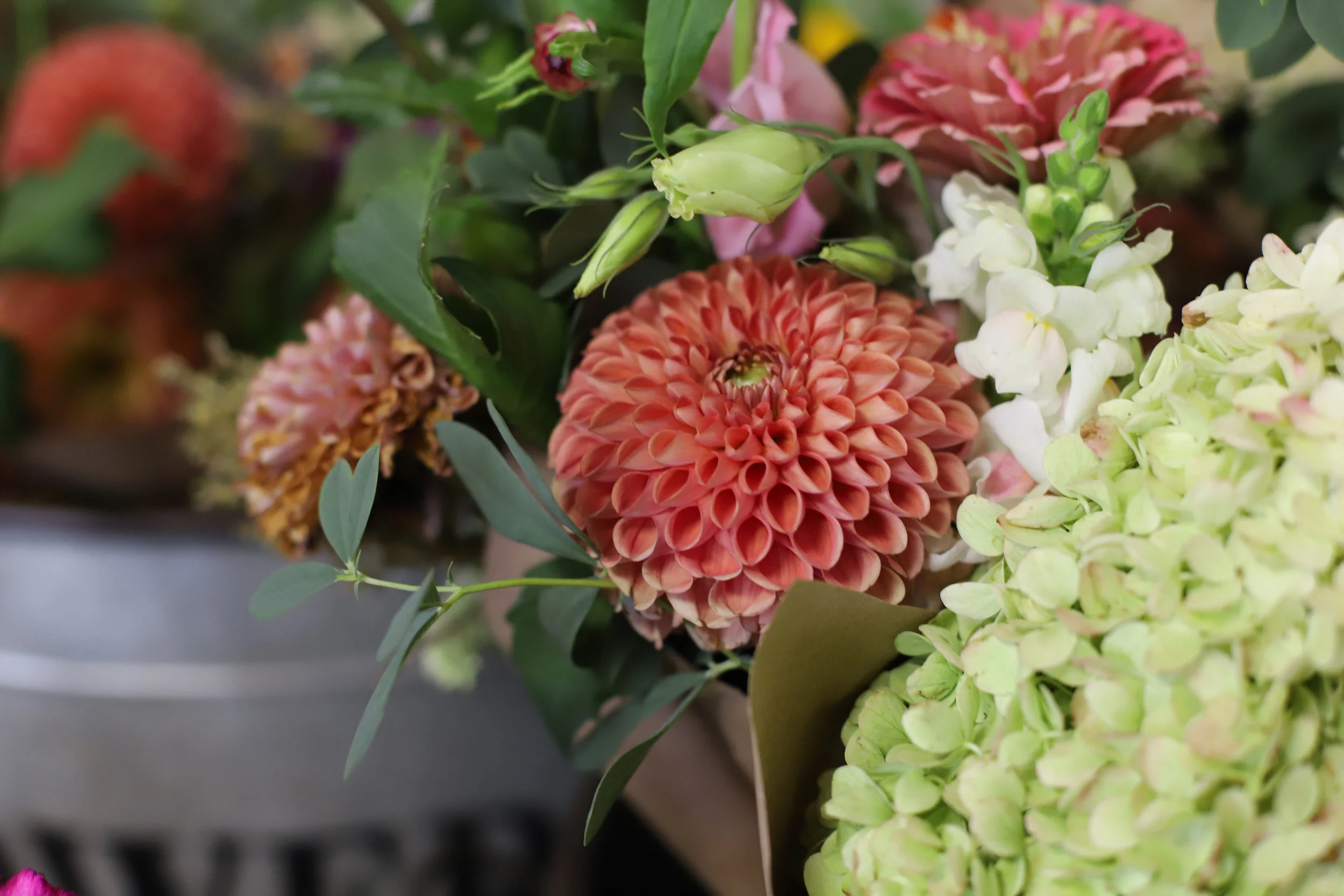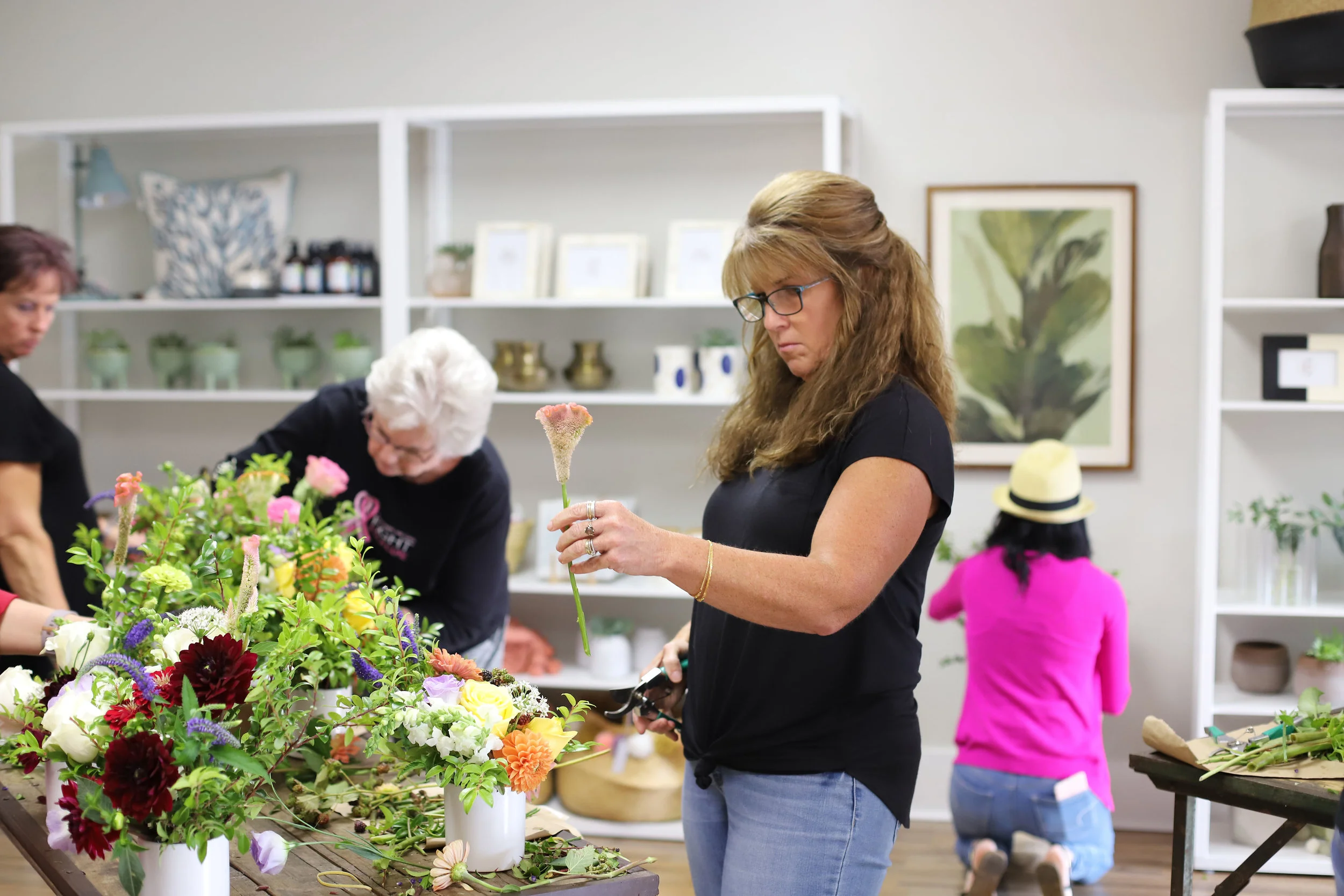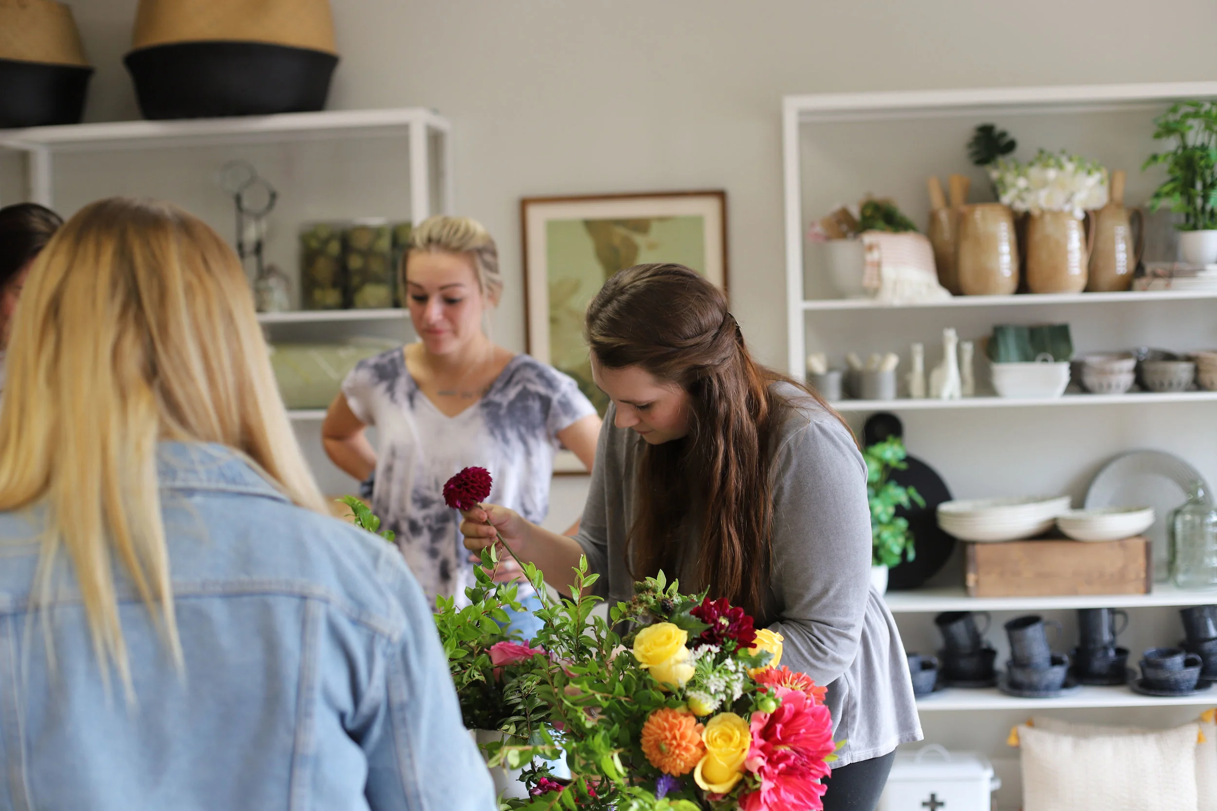 IN AUGUST, THE SHOP WAS FILLED WITH BEAUTIFUL LOCALLY SOURCED DAHLIAS, ZINNIAS, ALLIUM, SNAPDRAGONS, VERONICA AND CELOSIA. WE HAD SUCH A FUN NIGHT CREATING A GORGEOUS FLORAL CENTERPIECE!