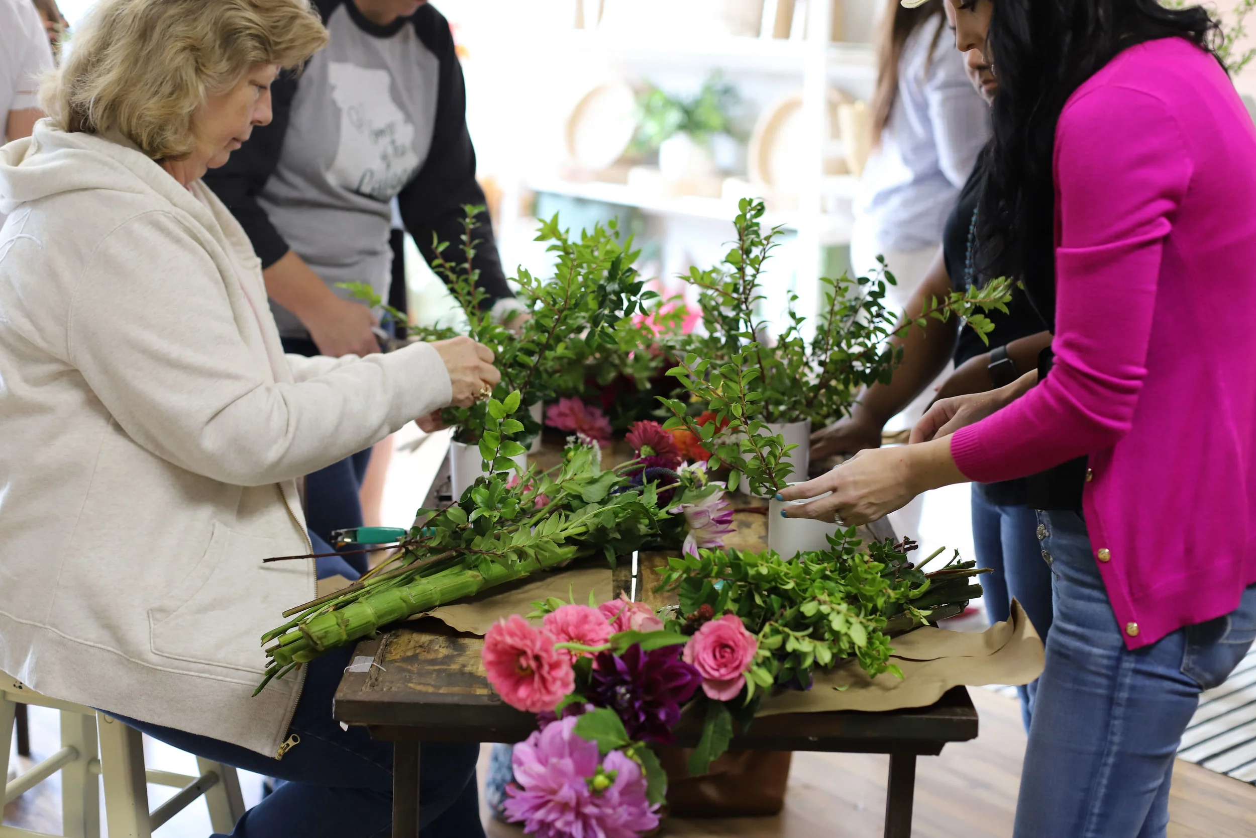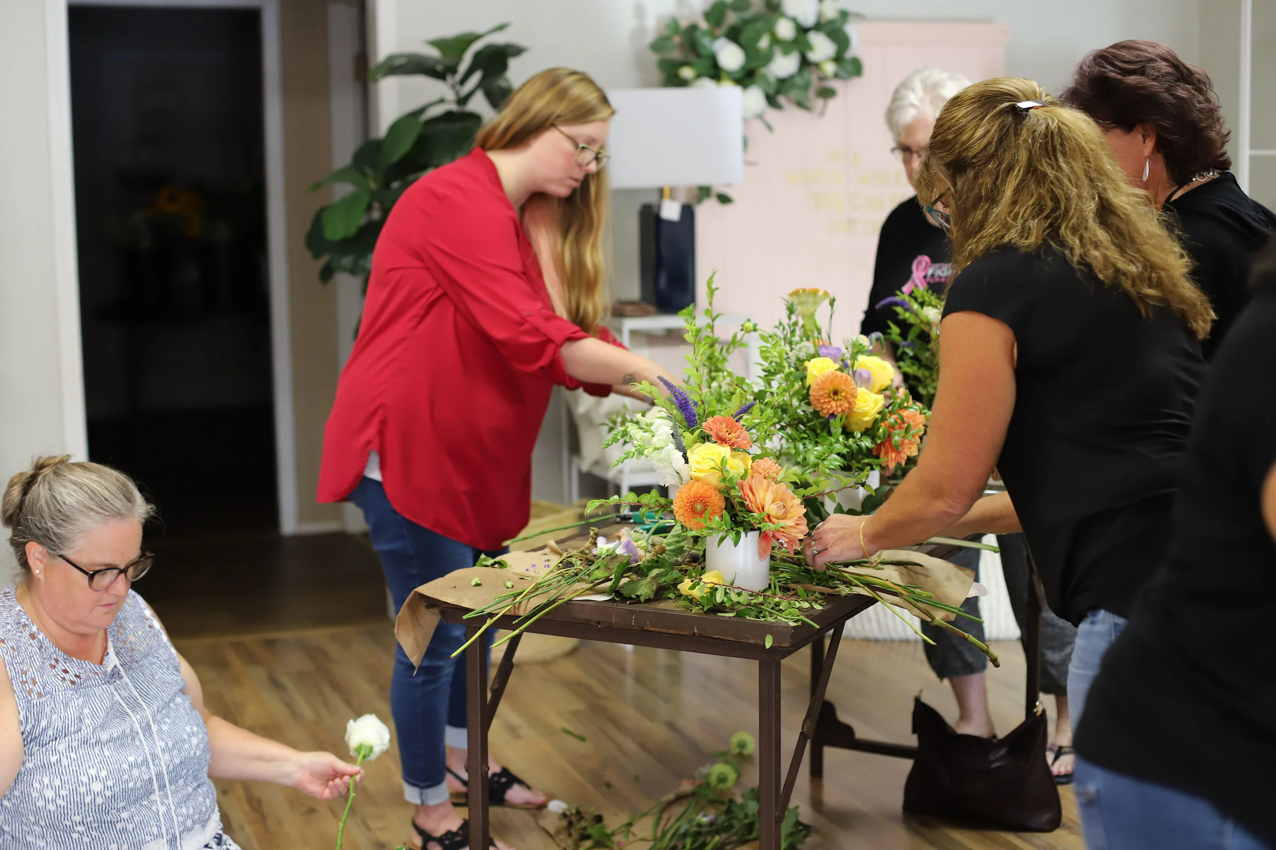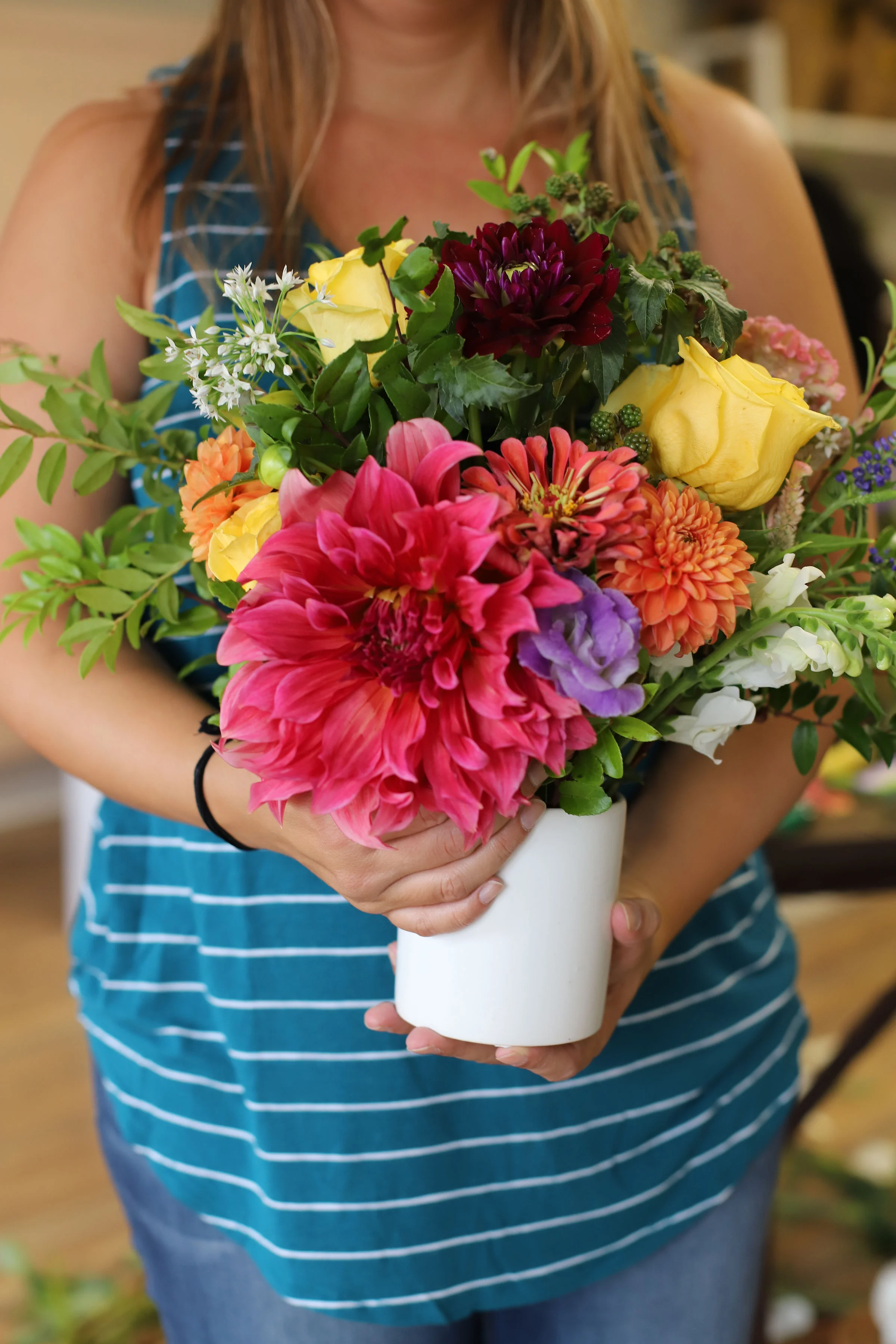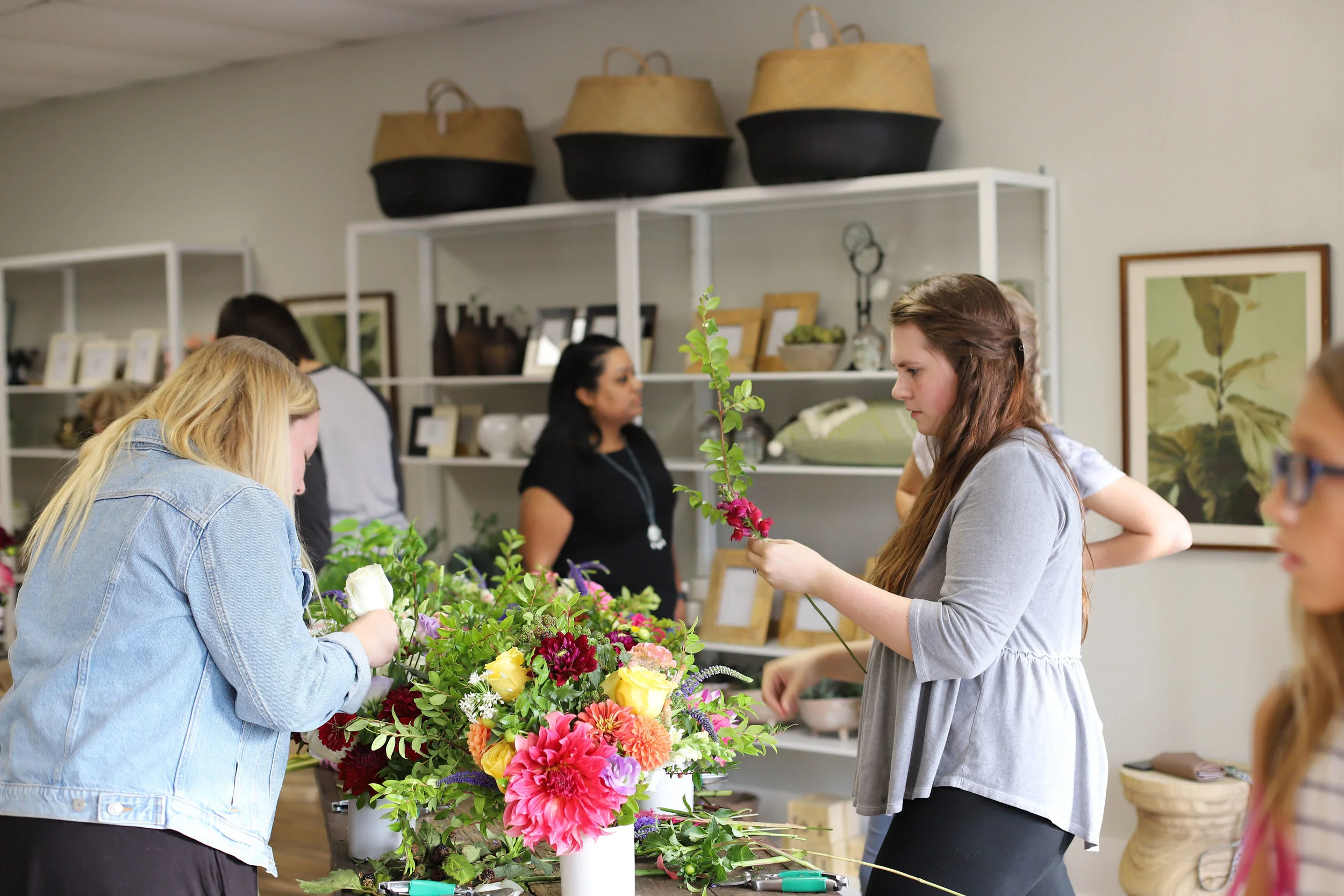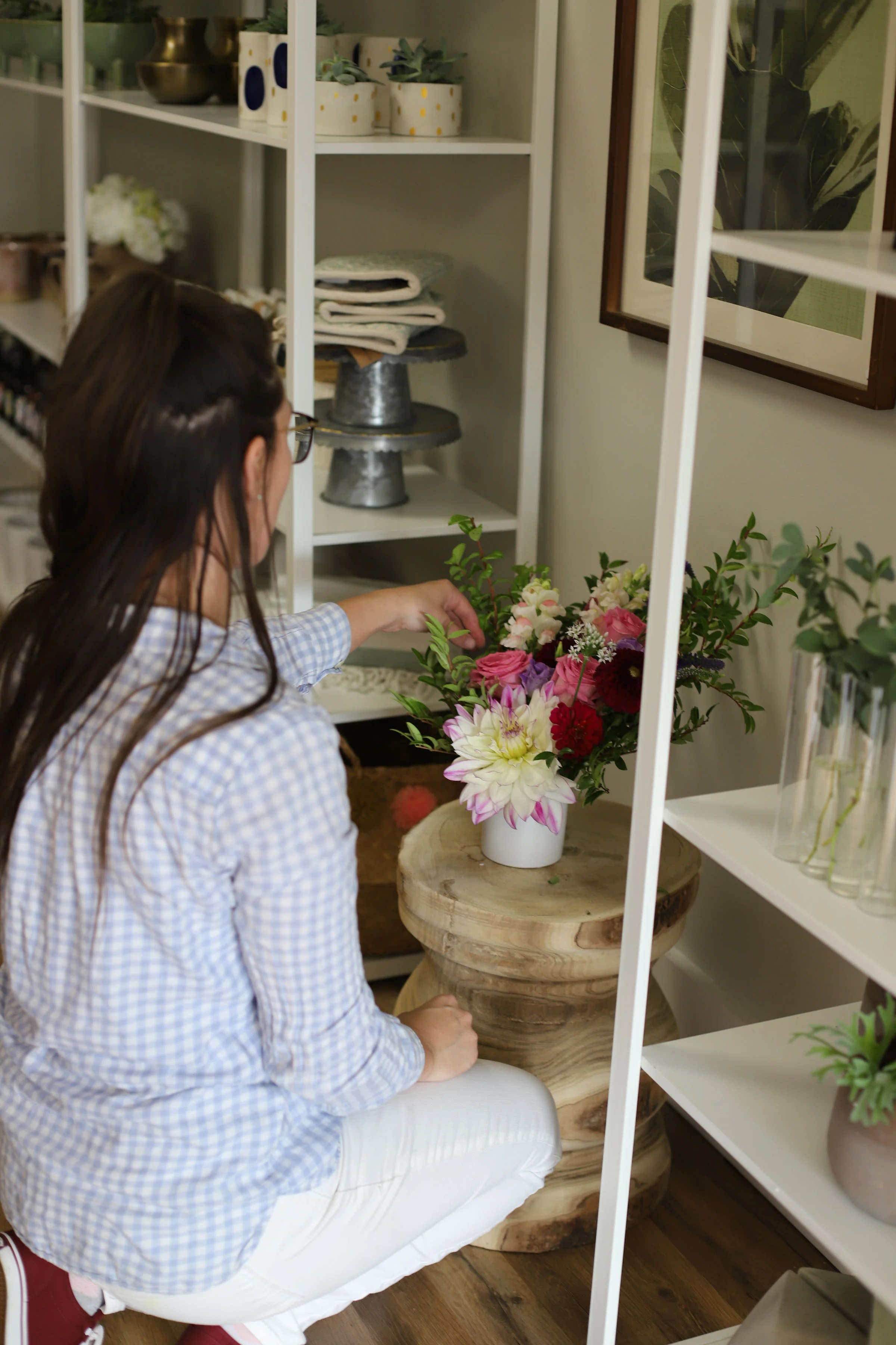 IN AUGUST, THE SHOP WAS FILLED WITH BEAUTIFUL LOCALLY SOURCED DAHLIAS, ZINNIAS, ALLIUM, SNAPDRAGONS, VERONICA AND CELOSIA. WE HAD SUCH A FUN NIGHT CREATING A GORGEOUS FLORAL CENTERPIECE!