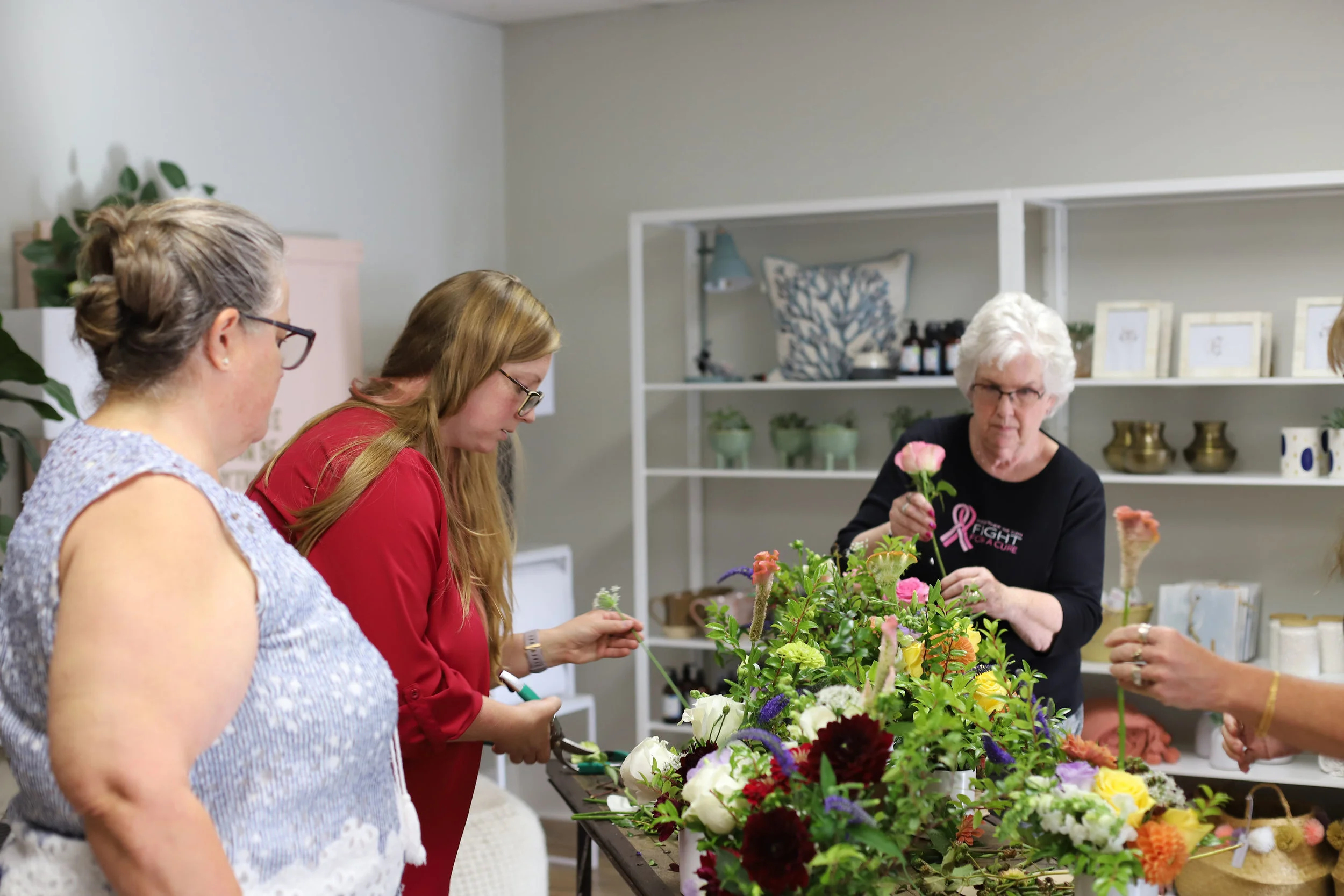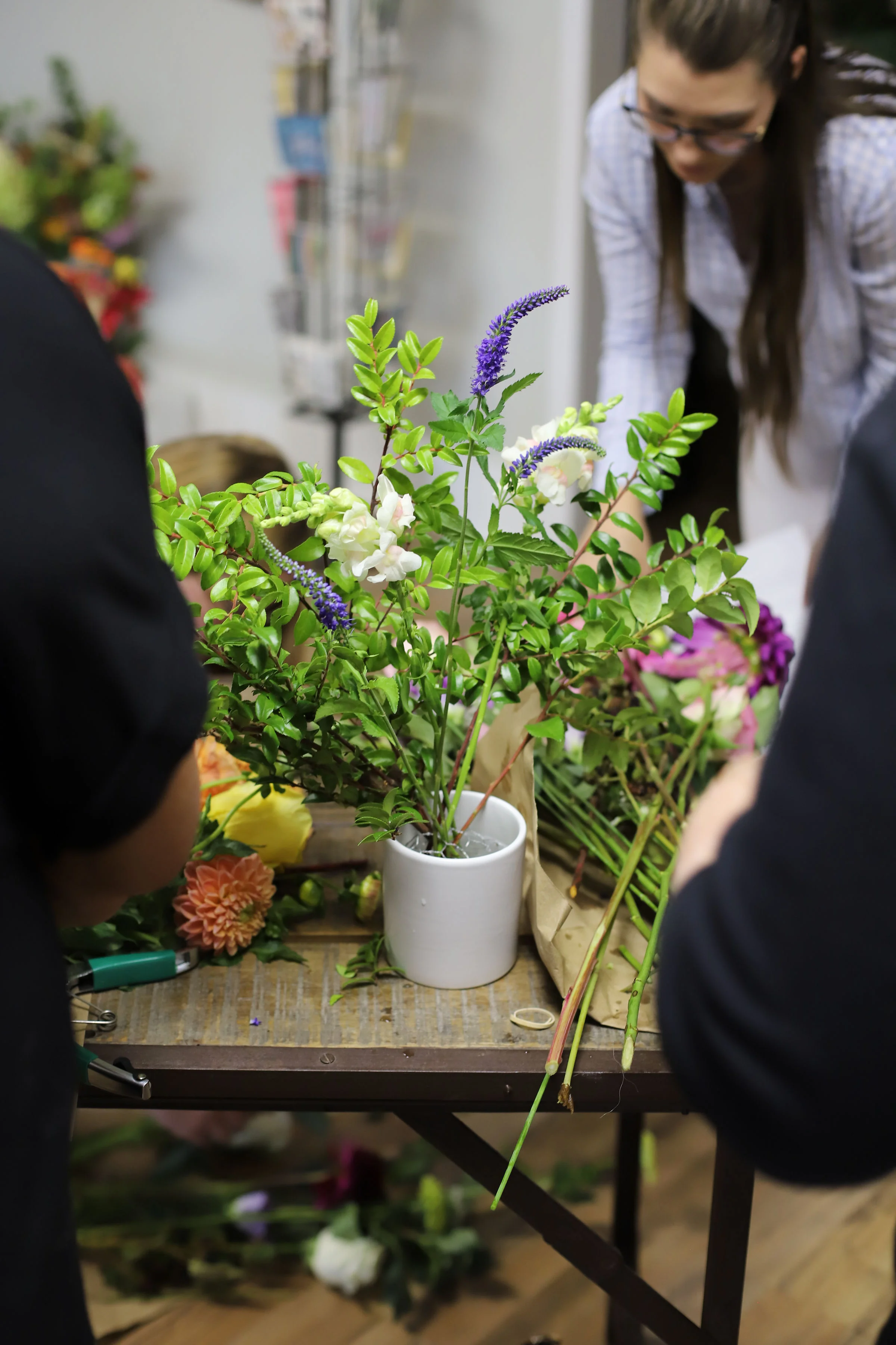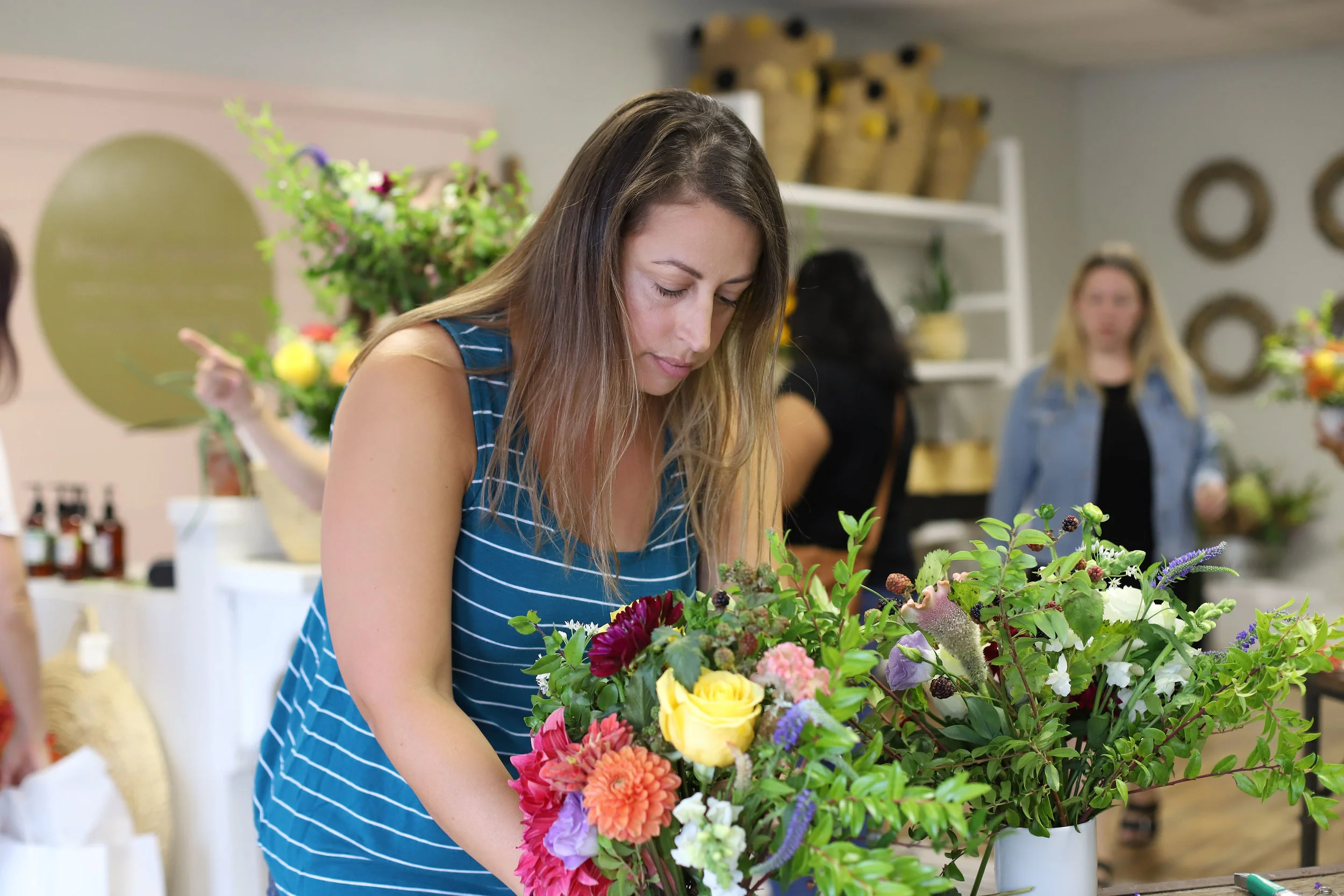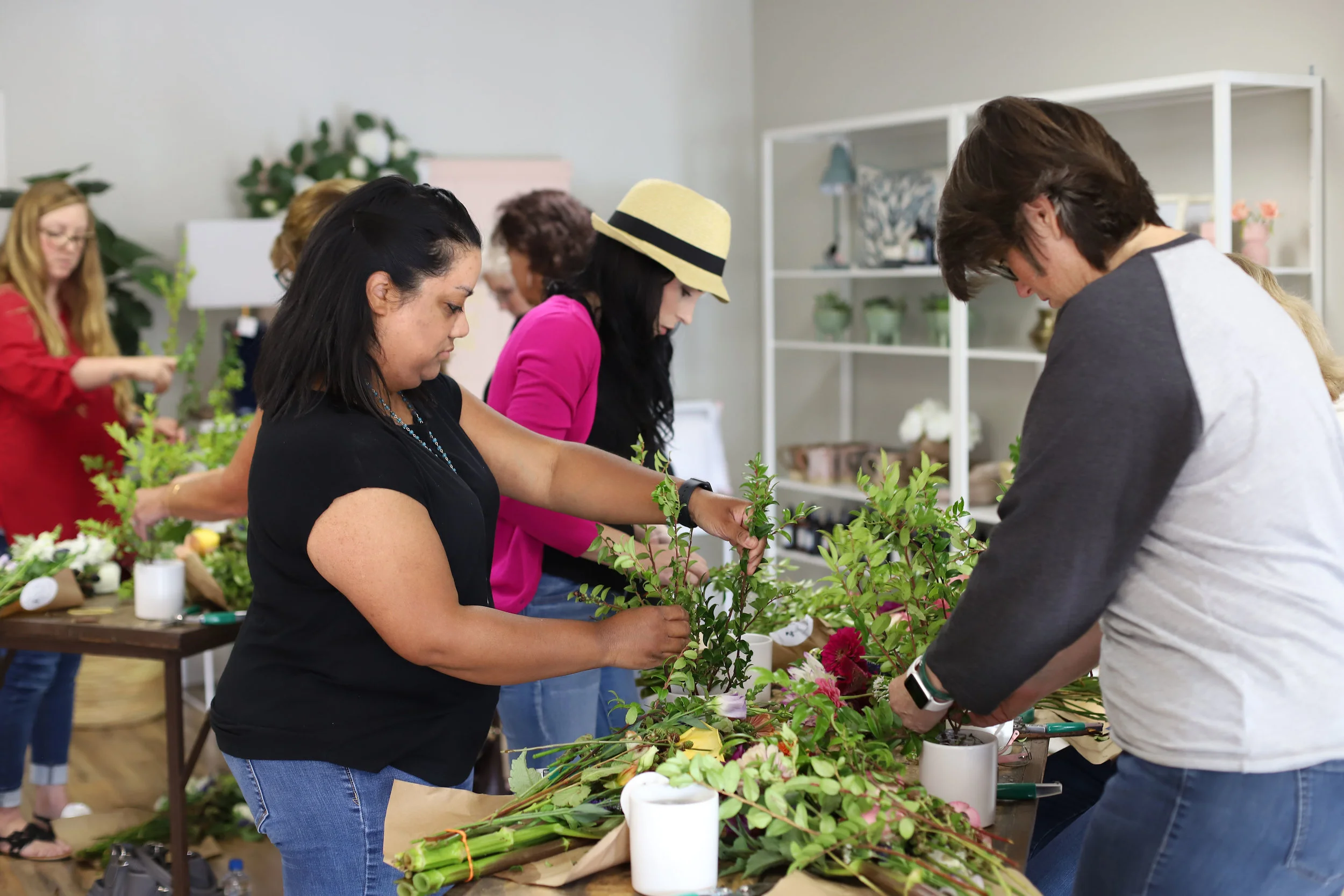 IN AUGUST, THE SHOP WAS FILLED WITH BEAUTIFUL LOCALLY SOURCED DAHLIAS, ZINNIAS, ALLIUM, SNAPDRAGONS, VERONICA AND CELOSIA. WE HAD SUCH A FUN NIGHT CREATING A GORGEOUS FLORAL CENTERPIECE!