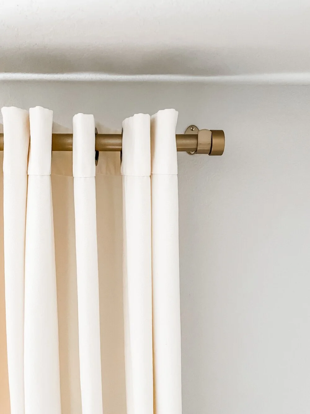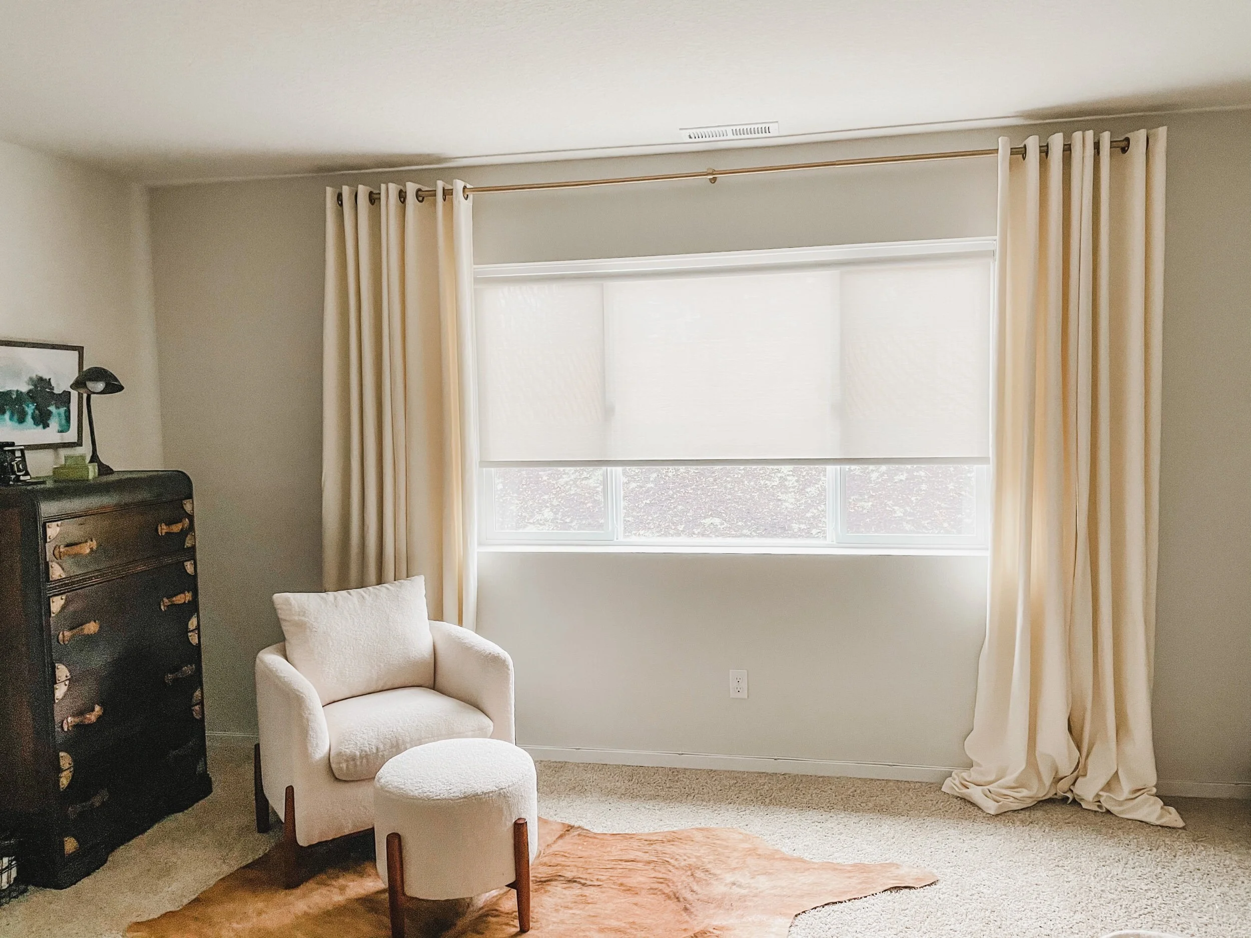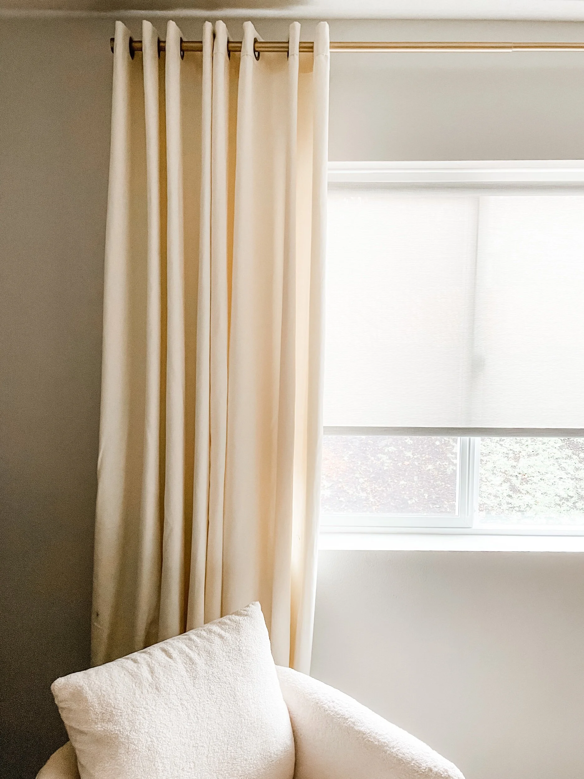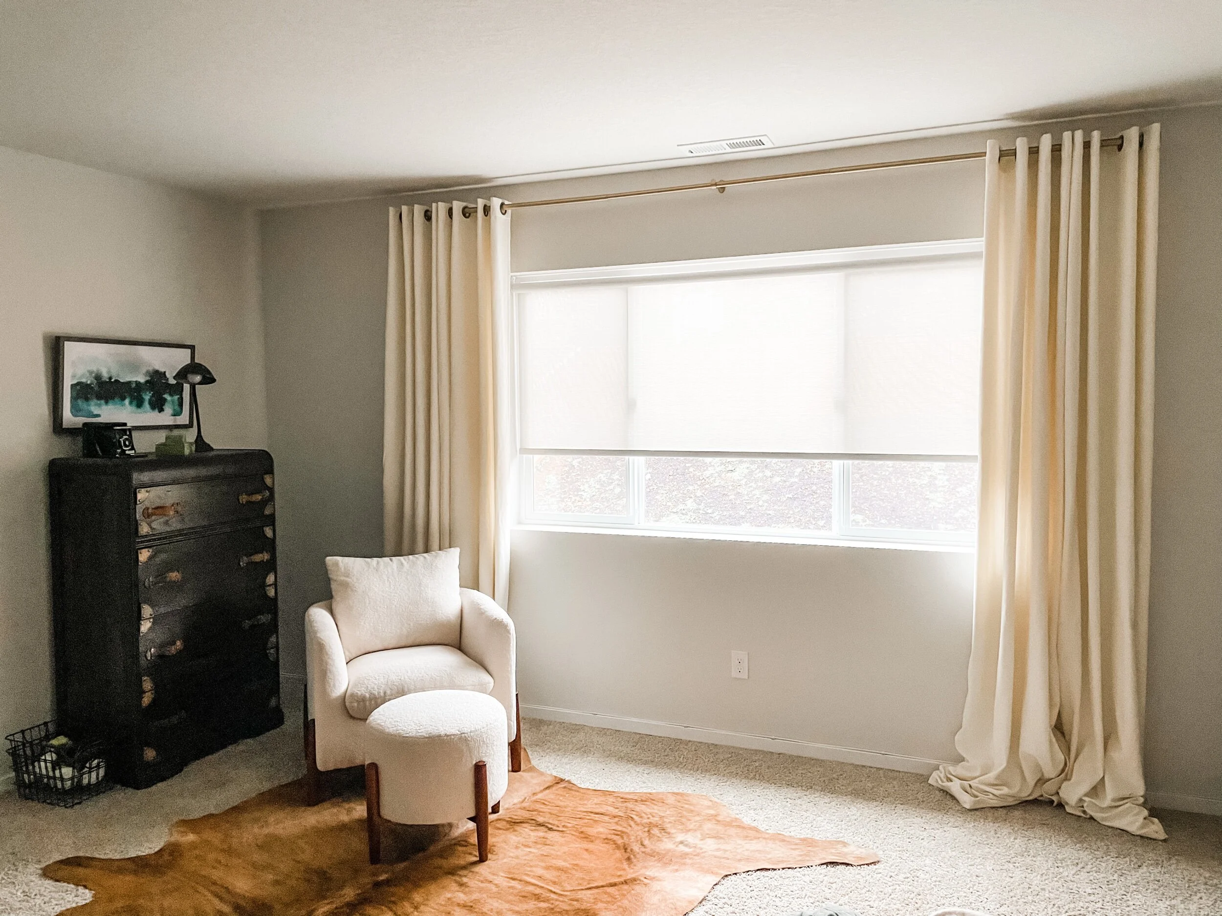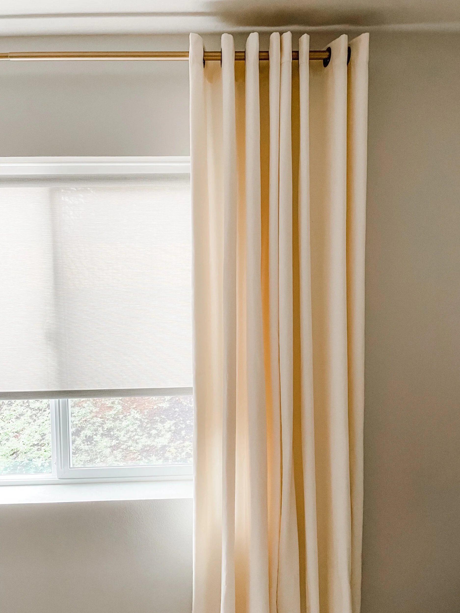 Installation was super easy and only took about 15-20 minutes. All I needed was a tape measure, pencil and a drill but you could also use a screwdriver in place of the drill. Now that the shade is up, I hung my favorite drapes on a brand new modern curtain rod in soft gold. You won’t believe the price on this rod! It looks like my favorite rod from West Elm but at a much lower price point.