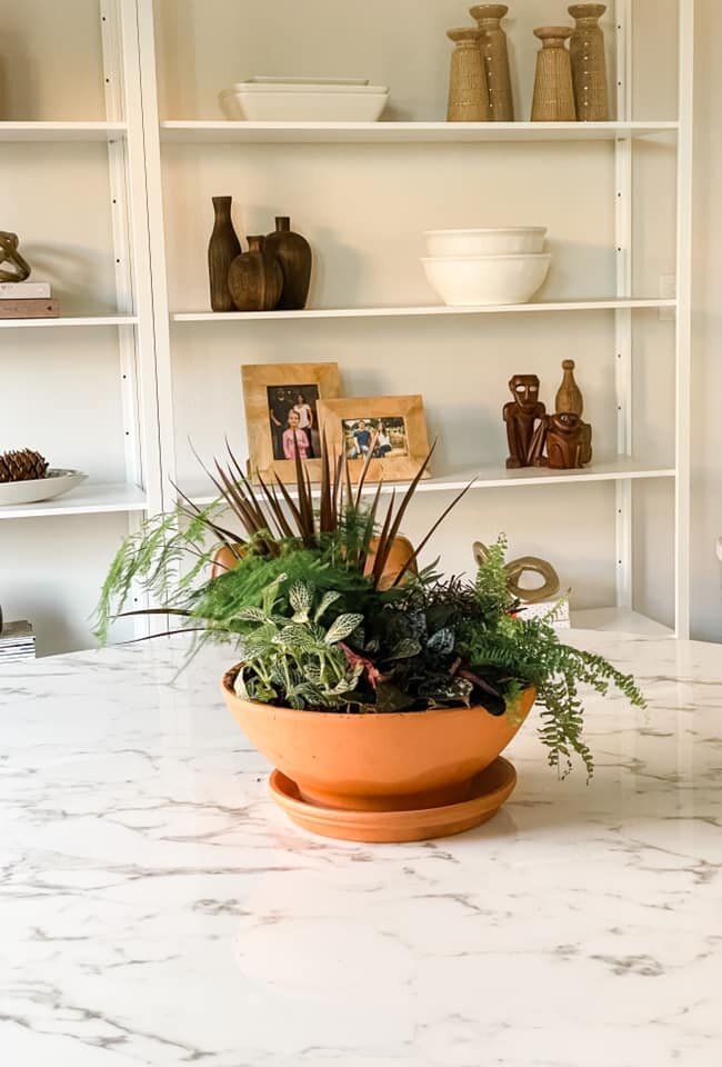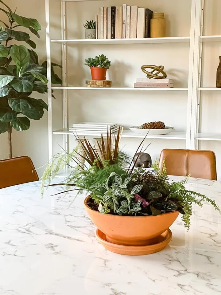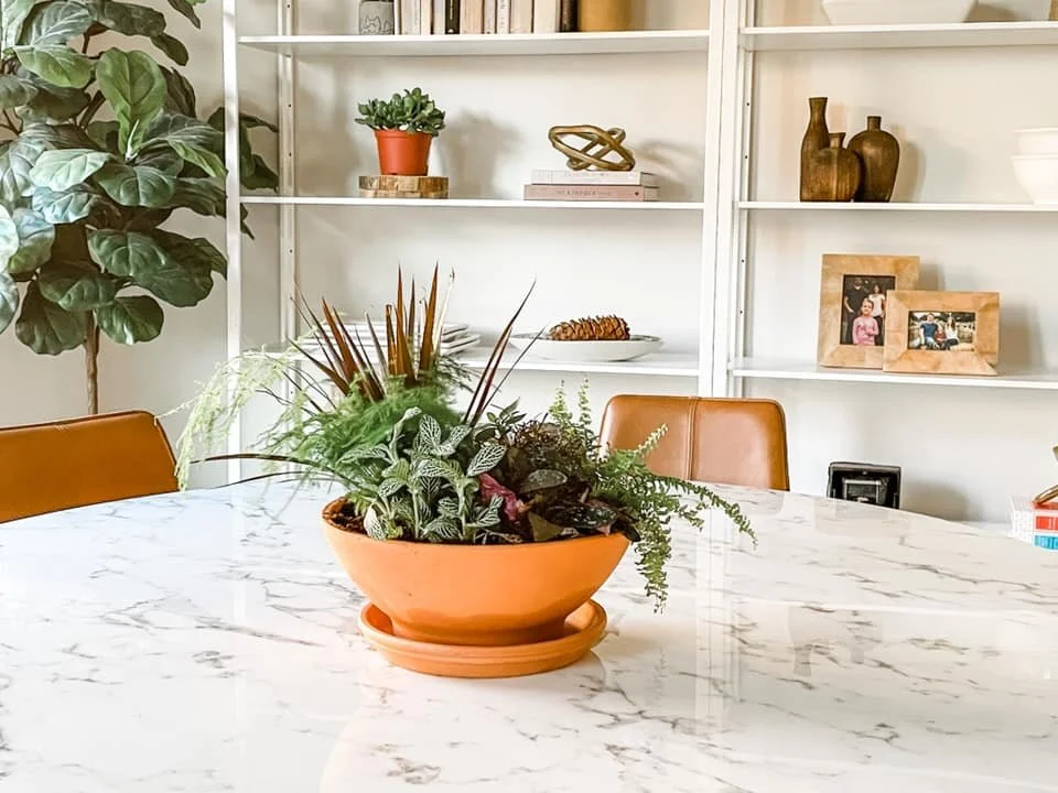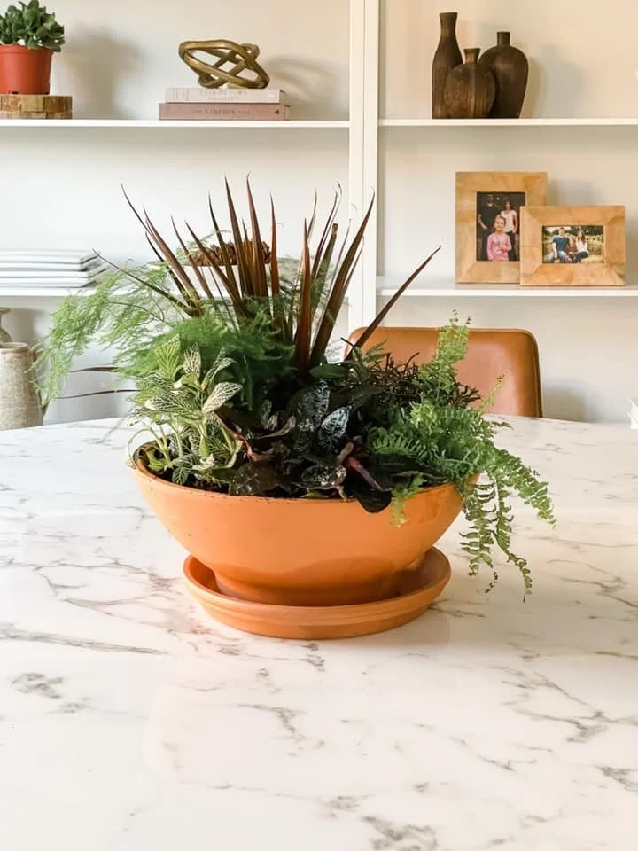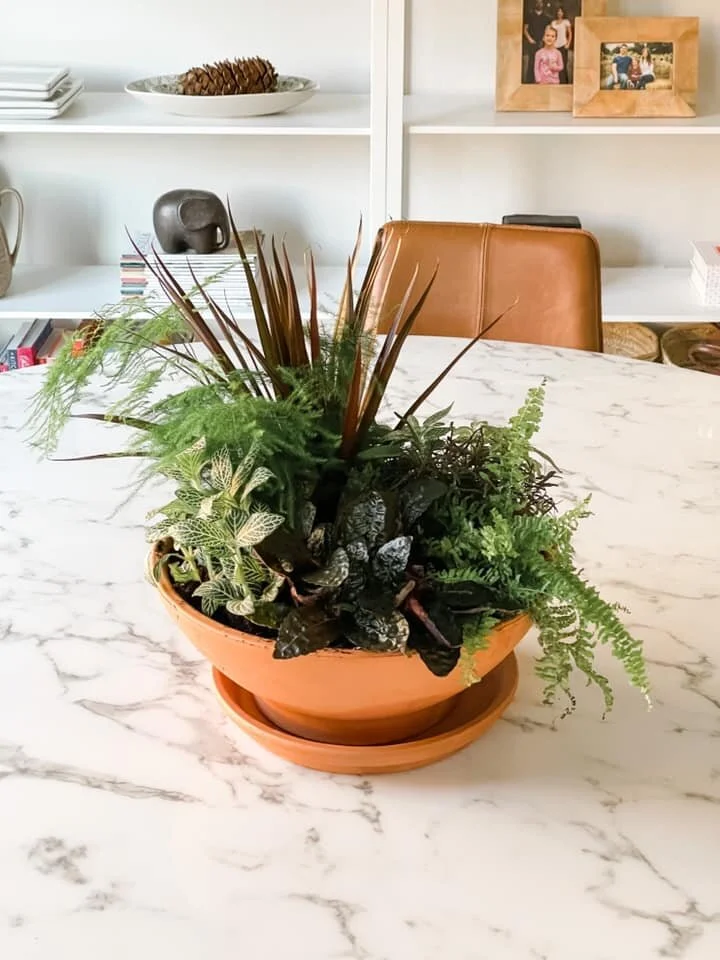 I saw this Terracotta Clay Low Bowl Planter and saucer at Lowes and I knew immediately I wanted to use it for a plant centerpiece. Terracotta is one of my favorite materials. I love its warm color, the porous texture that allows roots to breathe and it naturally balances the PH for healthier plants.