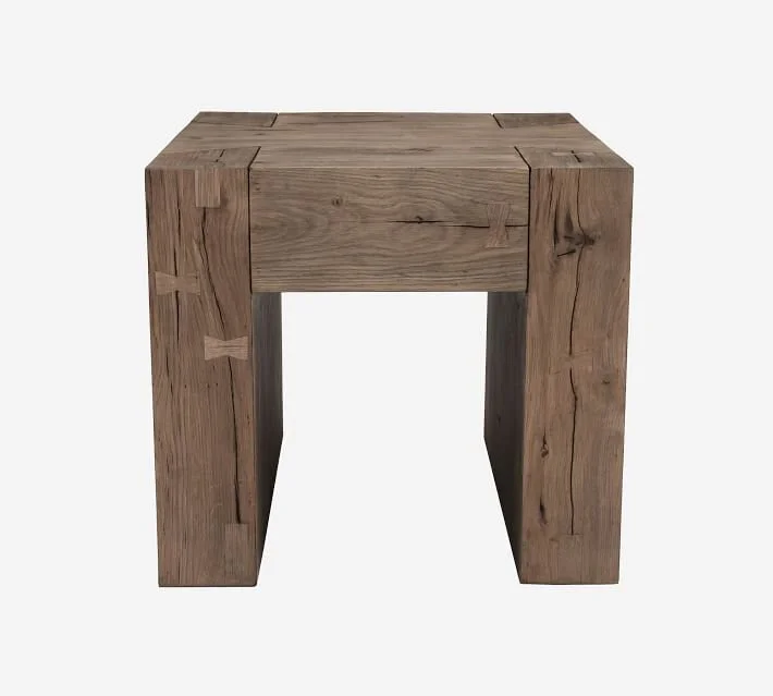 To keep the room from feeling too heavy, I opted for a different wood tone on the end tables. I love the oversized dovetail joinery detail that this end table features.