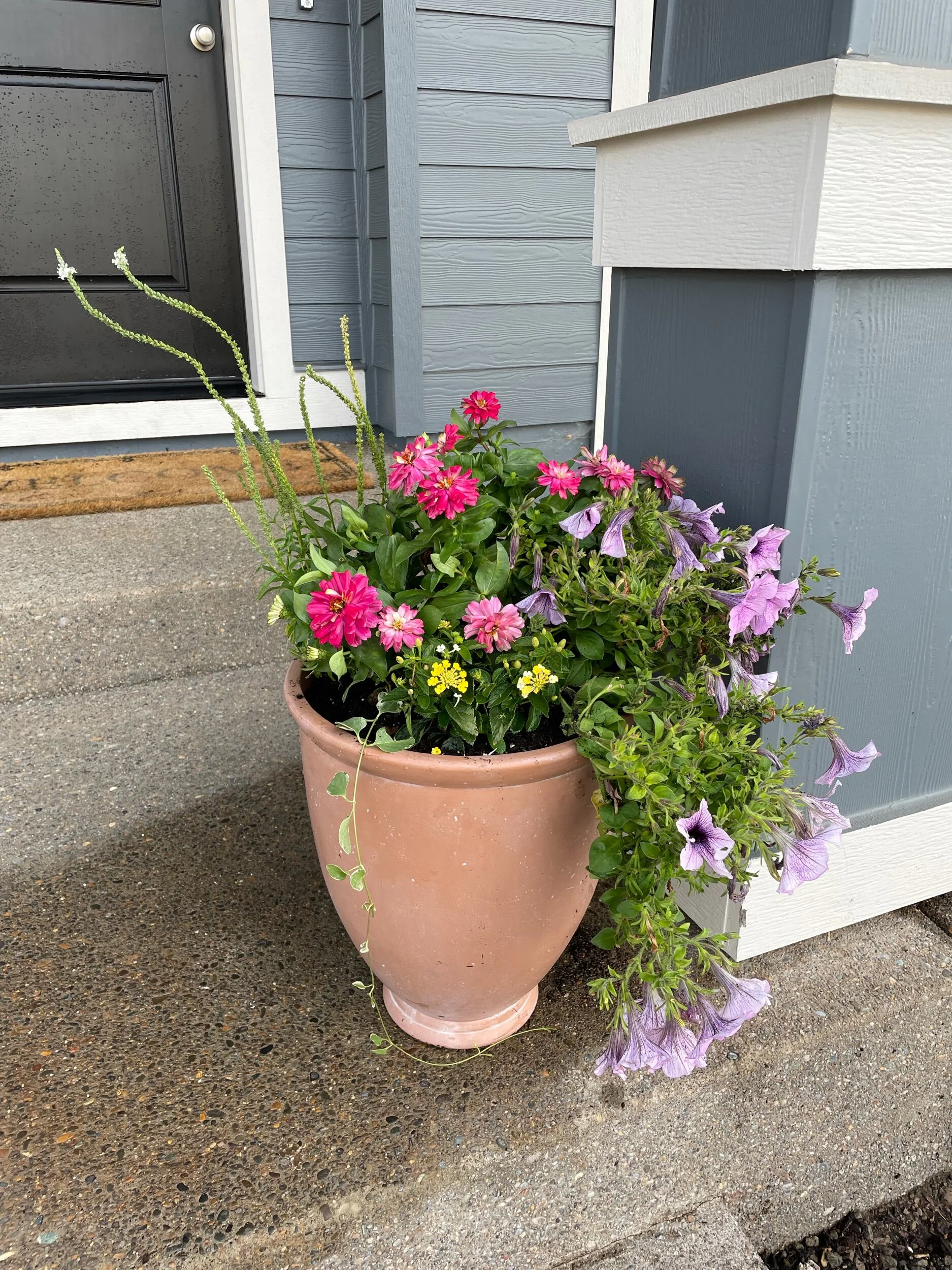 I choose the plants I used based on the big three categories, thriller, spiller, and filler. I was drawn to the purple petunias immediately and knew I wanted them to be the star. I added a pretty veronica plant for its tall spikes, my favorite flower to grow, zinnias to fill out and balance the other plants, cute yellow lantana plant, and variegated vinca that will also spill over the edges for more interest.