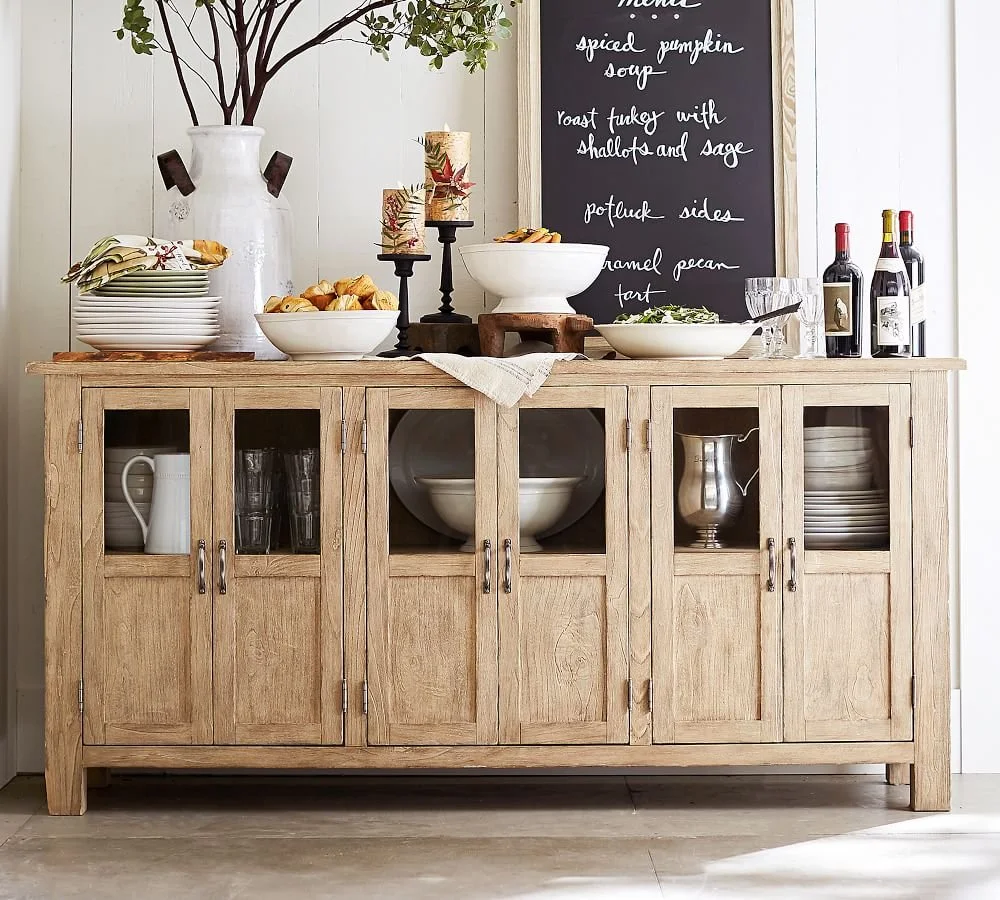 Along with the table and chairs, you may also need some storage or a place to serve food and drinks. Some types of storage pieces to consider are built-ins (if you’re lucky!), sideboards, buffets, hutch, or china cabinets depending on what kind of storage you need. A sideboard and buffet both offer a long surface area for serving food and drinks. Buffets may or may not have additional closed storage, while the sideboard has a nice amount of closed storage. Generally, sideboards are narrower and have shorter legs than a buffet with cabinets that go down to the floor. A hutch or china cabinet both show off your dishes and often have some closed storage. The main difference between the two is that a hutch is two pieces, the hutch and the cabinet while the china cabinet is one single piece.