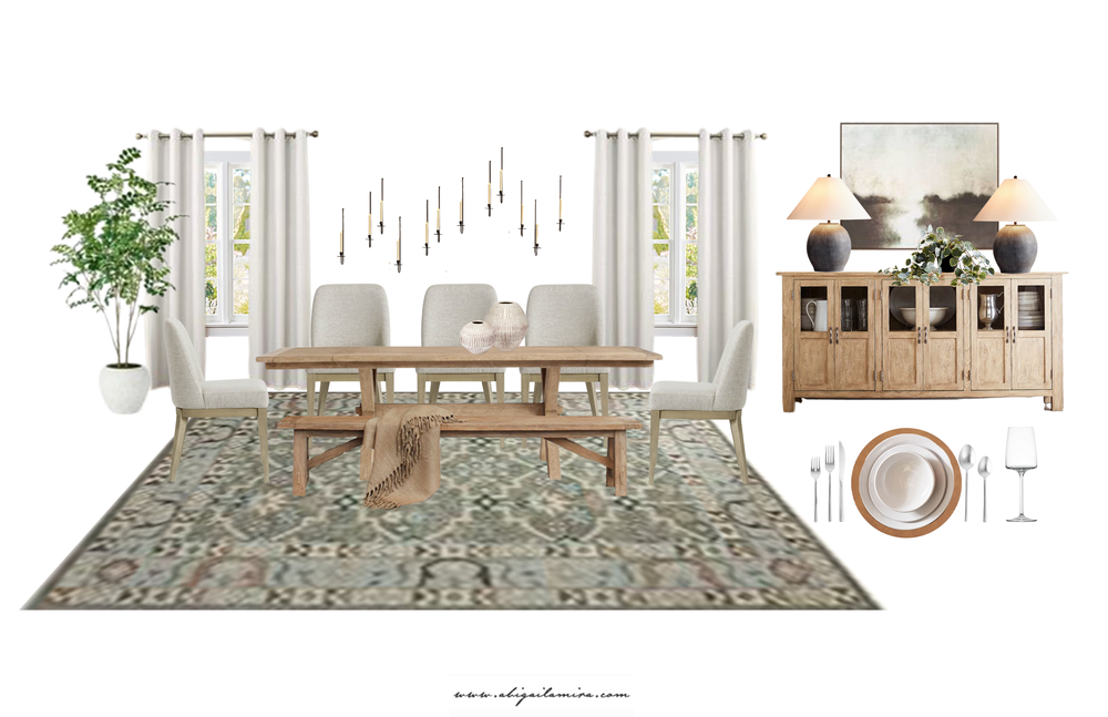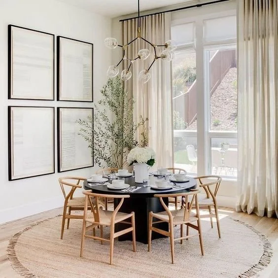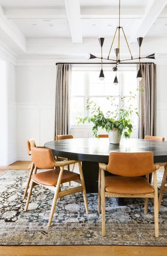 This is the most controversial decision my clients have for the dining room. Some people are strongly against having a rug underneath the dining table while others prefer it. I personally love rugs under the dining table and I will share with you why I do. A rug will anchor the eating space, create more defined walkways, add a pop of color, can prevent the chairs from scraping the flooring, and I have very cold hands/feet so I like my feet to be on a rug instead of the bare floor. I always recommend going as large as you can with your rug (in any room), you definitely want to ensure you have a minimum of 3 feet from the edge of the table to the end of the rug so you can easily pull out chairs without their legs slipping off of the rug (nobody wants to sit in a wobbly chair).