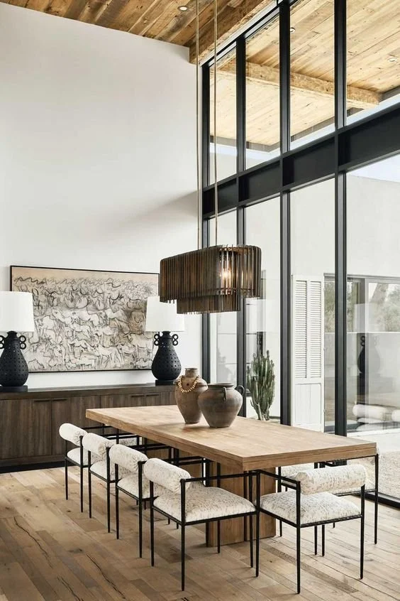 There are so many different types of materials out there. Wooden chairs are classic and come in so many different styles and finishes. Metals chairs can provide contrast and interest in your space. Acrylic chairs can be so unexpected in a dining room and they are perfect for small spaces. Natural fiber chairs like rattan provide warmth and texture to any room. Upholstered chairs are timeless and allow you to bring in color, texture, and patterns. They can also help soften the hard lines in your dining room. I love to mix materials to create a collected over time, cozy feel. For example, pair wooden side chairs with upholstered statement chairs at the ends of the table.