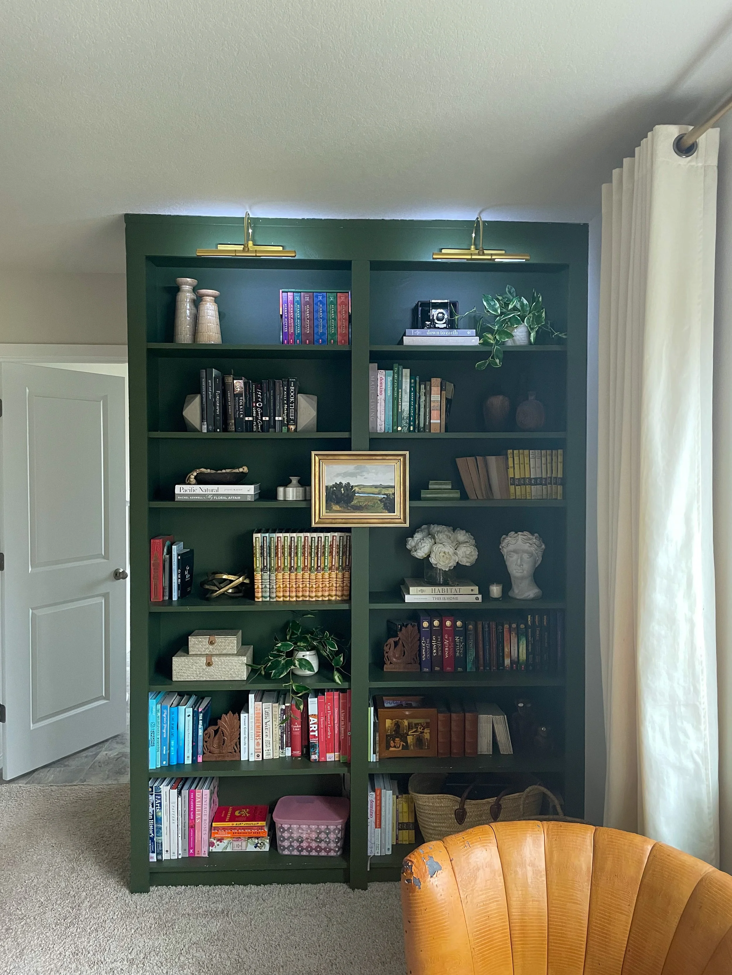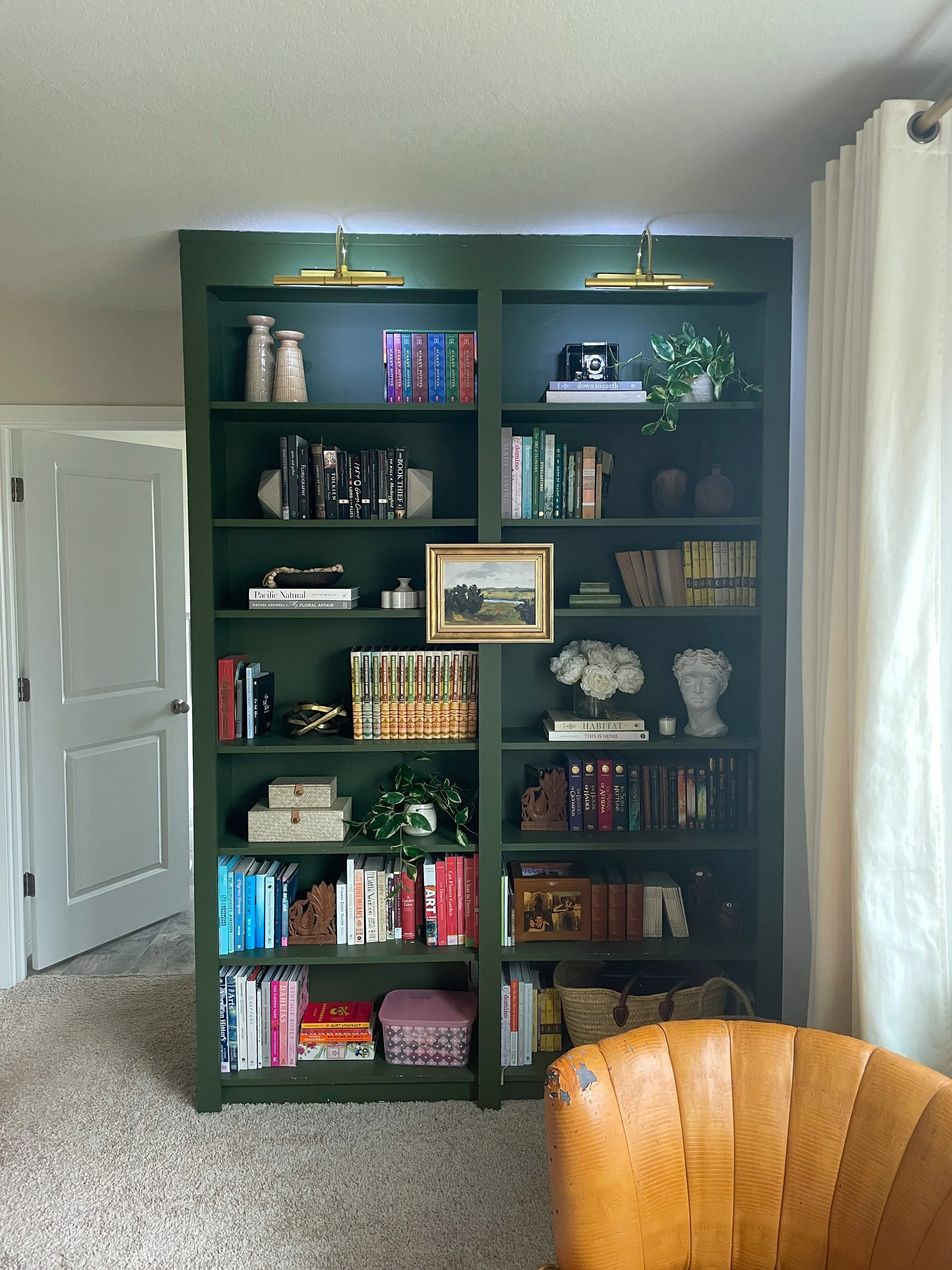 When I envisioned my mini-library, I wanted gorgeous picture lighting to illuminate my books and mementos. So, this weekend, I decided to tackle installing picture lights on my bookcases. It was a super easy project, taking less than 15 minutes to install! Read on if you want to add picture lighting to your home without calling the electrician.