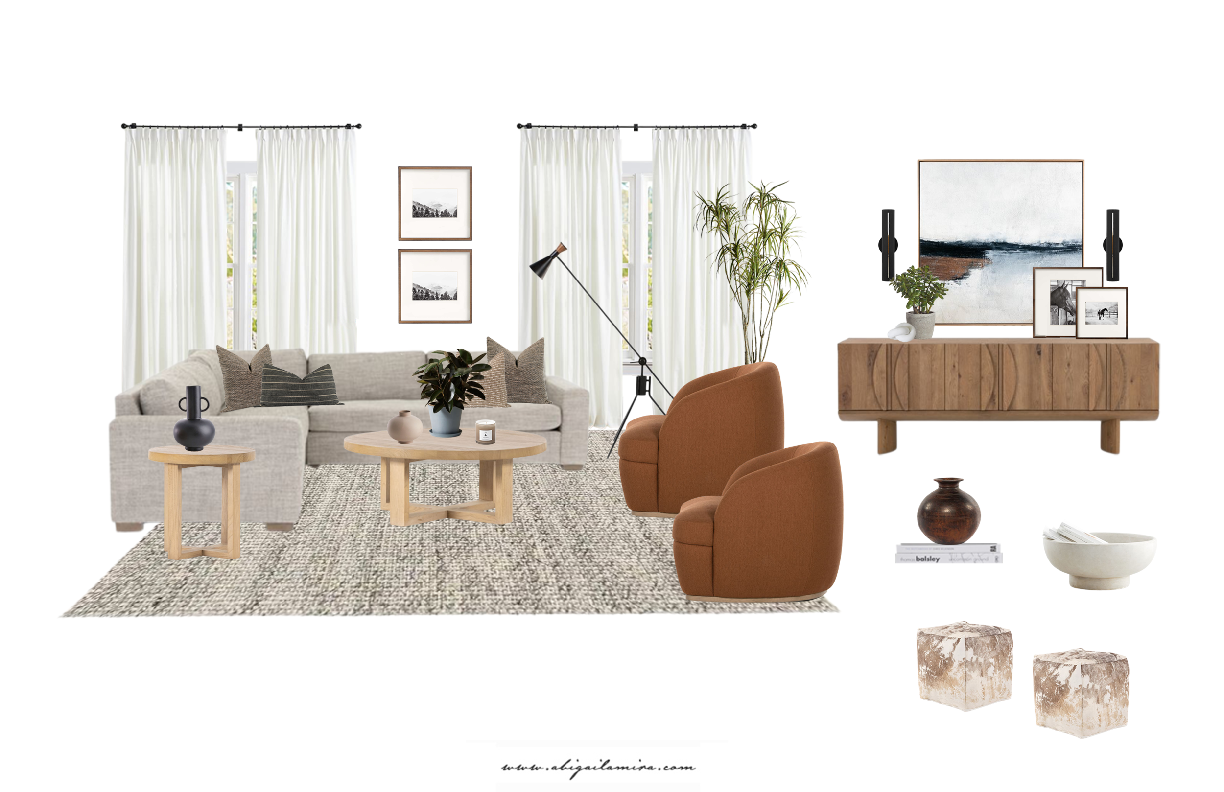 This contemporary living room is working with a minimal color palette of earth tones. I create interest with varying different textures and patterns to elevated the space. The all-over muted tones add a sense of coziness and warmth.