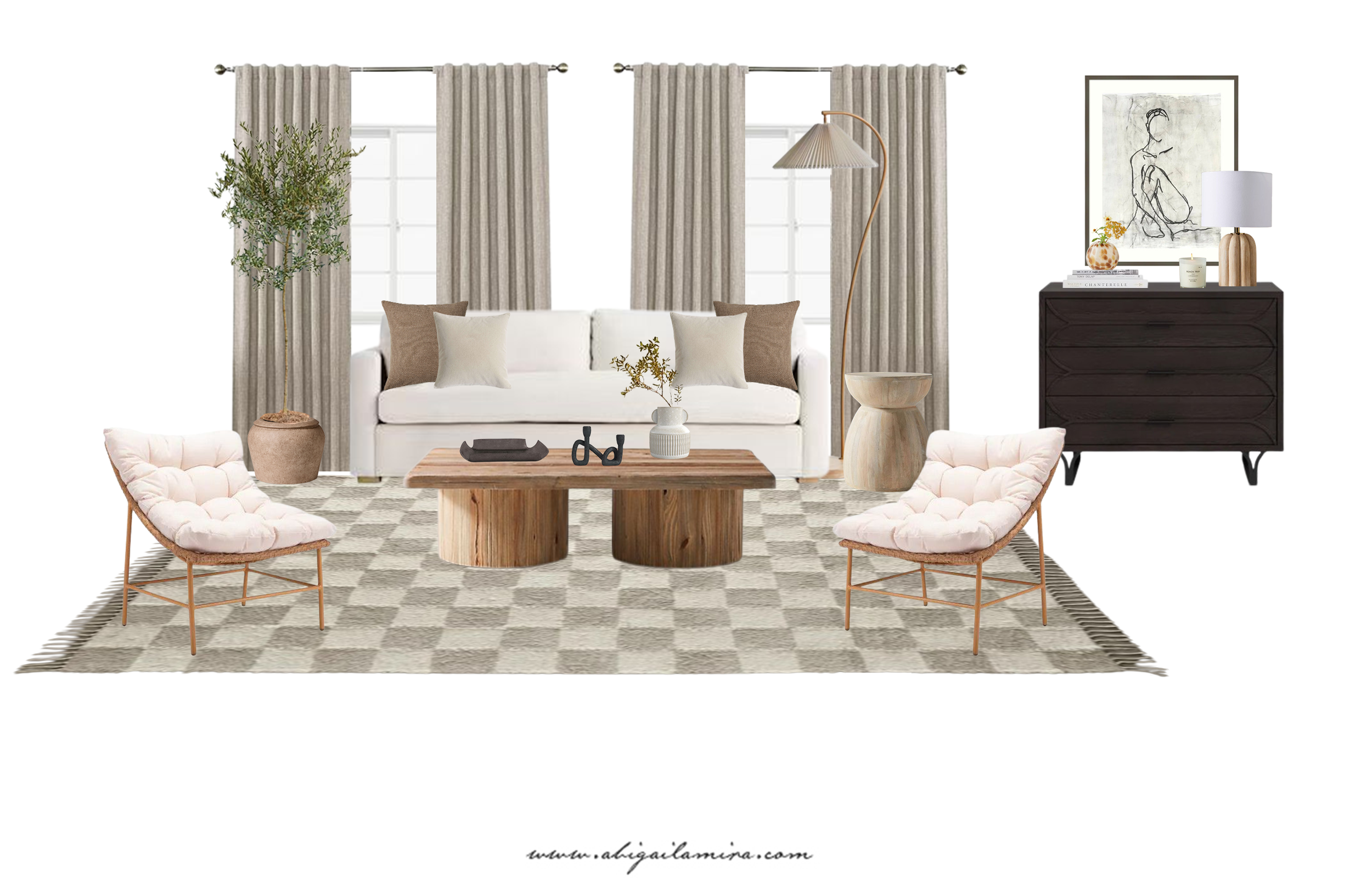 This neutral studio living room is designed with comfort and playfulness in mind. A neutral color palette combines different textures and materials with a contrasting chest to create another level of interest. The wood tones add warmth, while the checkerboard pattern rug and linen curtains soften the space.