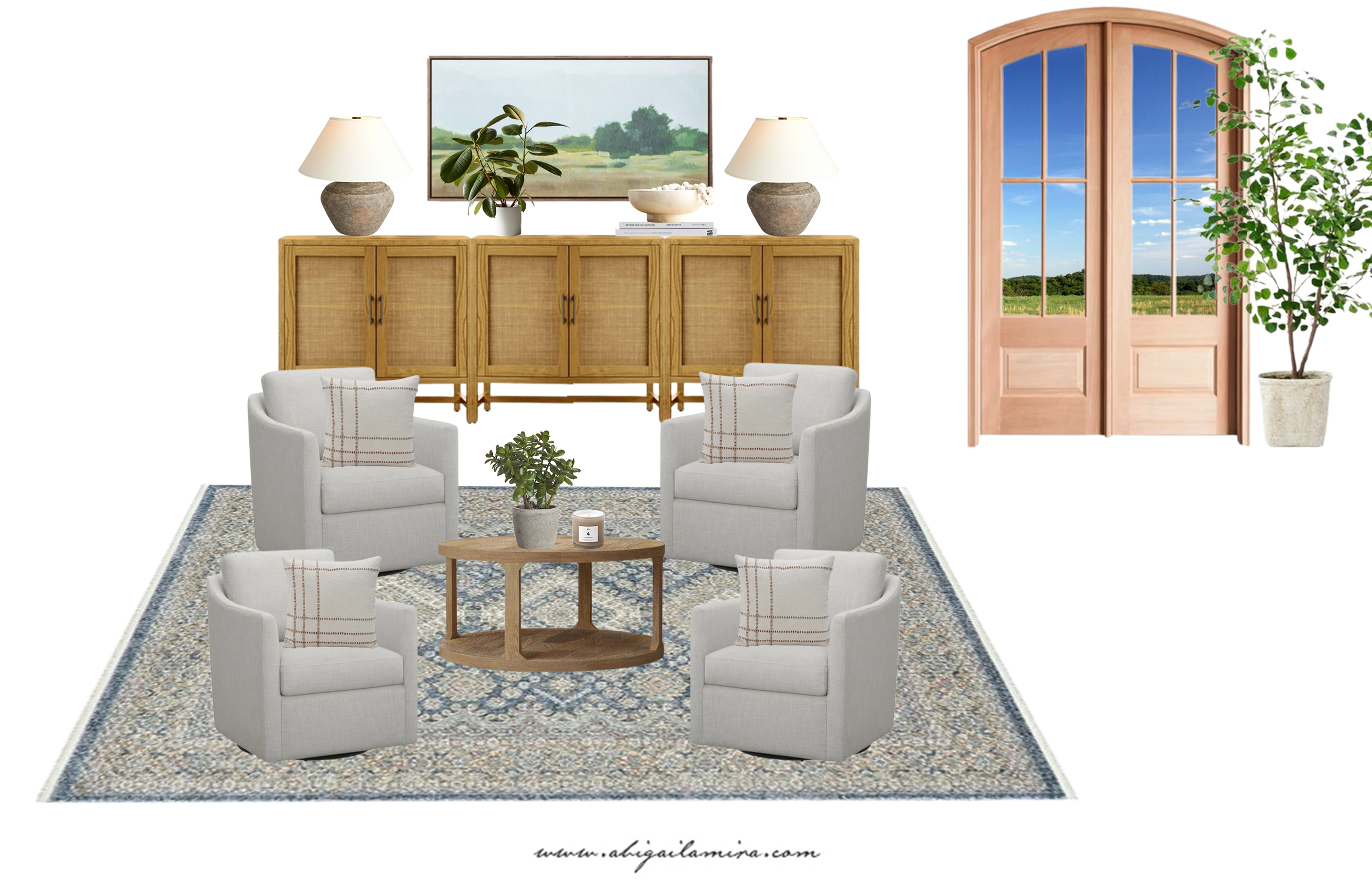 This relaxed conversational area is perfect for sharing stories over coffee, playing board games late into the night, or simply catching up with a friend. I pushed three cabinets together to create a nice long run of storage behind the four swivel chairs. The soft blue rug feels inviting and anchors the space. arched double doors add interest as well as a great view outdoors.