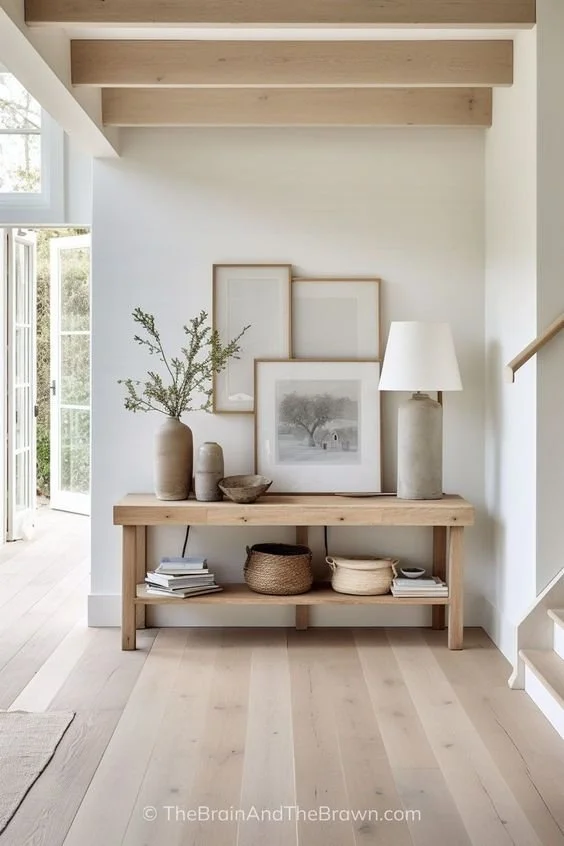 There are numerous captivating elements in this image: the beautiful flooring, layered art, beams, lovely vases, and the attractive door on the left.