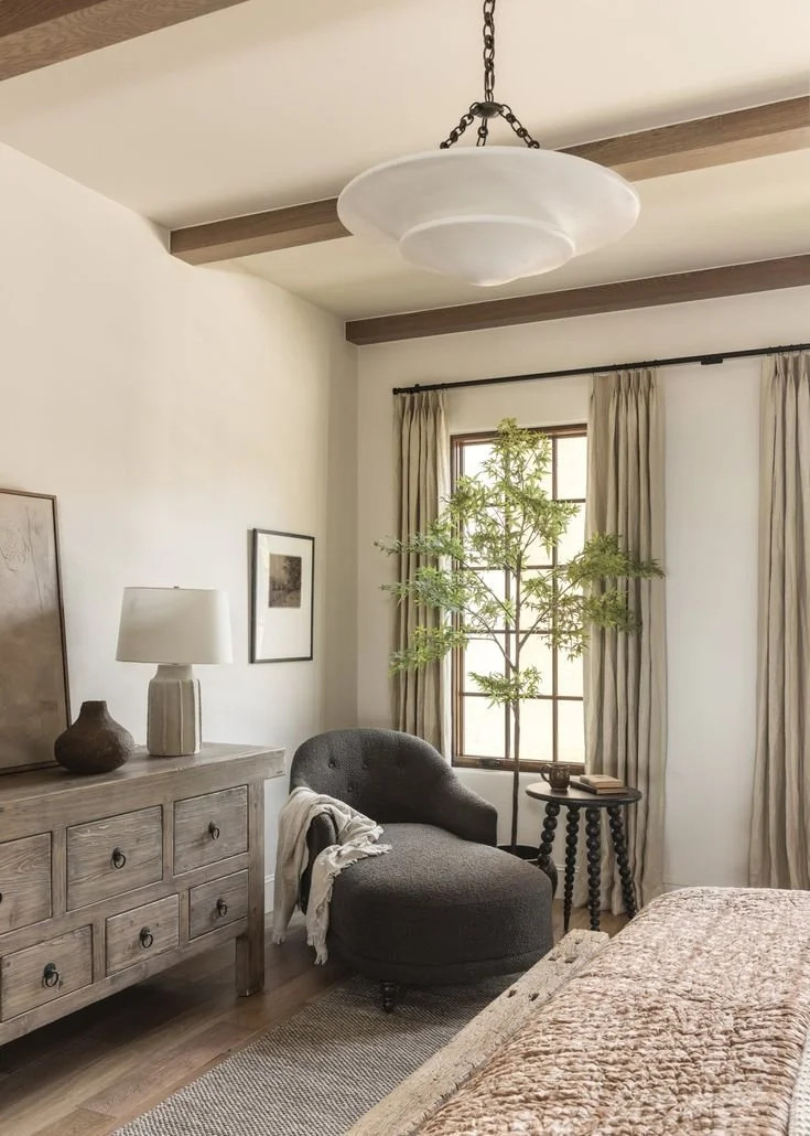 This room is fantastic on so many levels: the beautiful dresser, the chaise lounge, the drapes, and the tree complement the neutral walls perfectly.