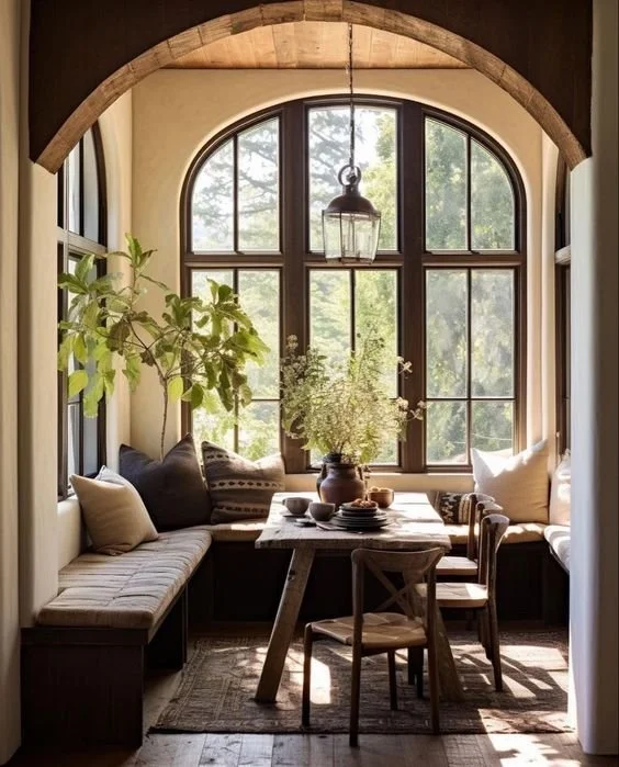 I love this breakfast nook for its large windows, banquette seating and the gorgeous arch.