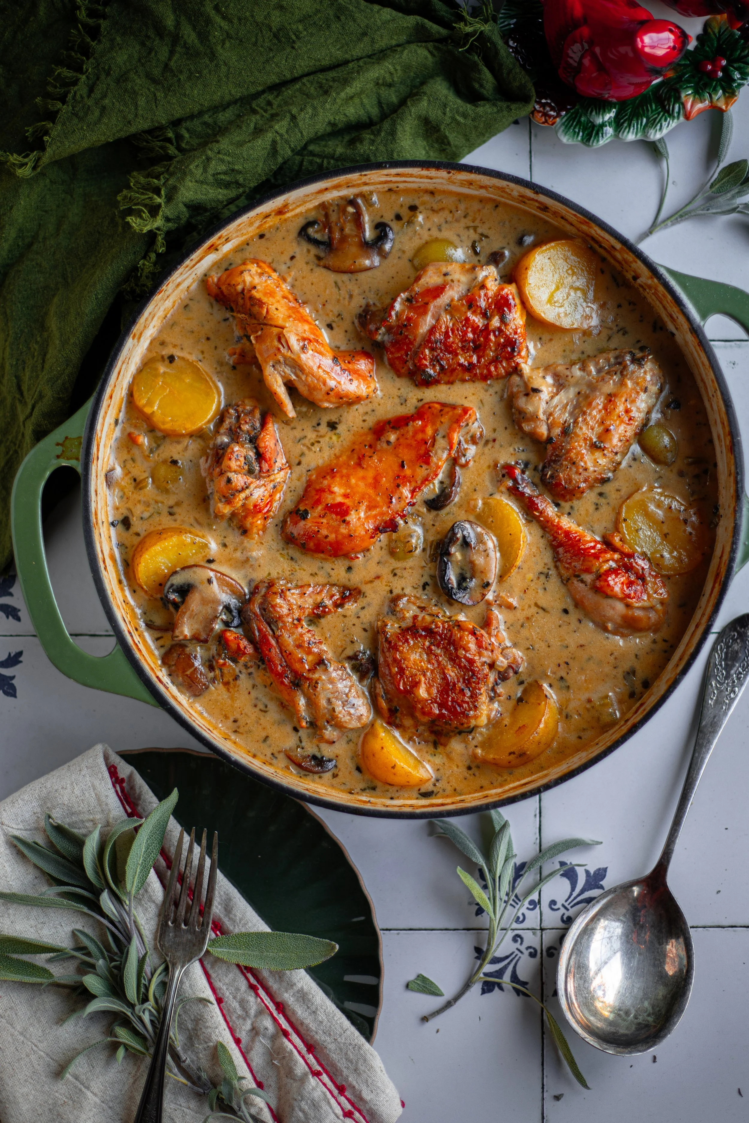 A perfect meal for winter, herb roasted chicken in a white wine sauce.