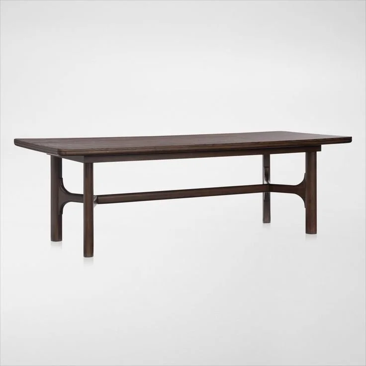 I love this table! It would work well in any style with its graceful curves and round legs. Table comes in this dark chestnut and a light natural stain and will comfortably sit up to ten people.