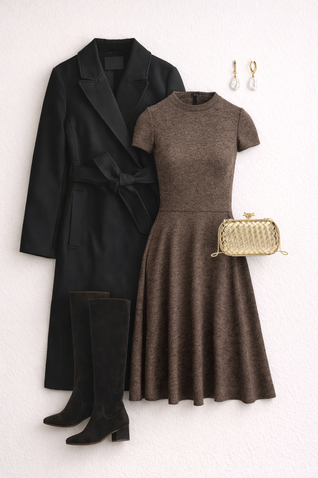 This outfit offers a refined and timeless take on fall dressing, perfect for a holiday gathering or an evening out. The knit midi dress creates an elegant, flattering silhouette, while the sleek black coat and tall suede boots add warmth and sophistication. Finished with pearl drop earrings and a gold woven clutch, this look brings just the right touch of festive polish without feeling overly formal.