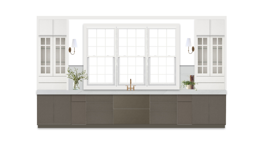 One of my favorite elements in this design is the contrast between the soft white upper cabinetry and the warm, moody lower cabinets. The darker base grounds the room and adds depth, while the lighter uppers keep everything feeling fresh and airy.