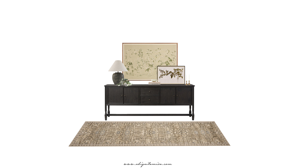 This vintage-inspired runner brings in subtle pattern and warmth while visually defining the area. It softens the look of the darker console and ties the entire palette together.