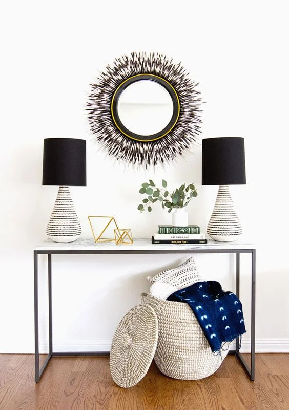 Want the perfect spot to welcome you and your visitors? Look no further! We love to use a charming console table paired with pretty lamps (a single lamp works well for small spaces) in this style entryway. We suggest hanging a statement mirror, perfect for quick touch ups before heading out the door. Add some functional decor, like a basket for hiding shoes and a small bowl to put your keys in.