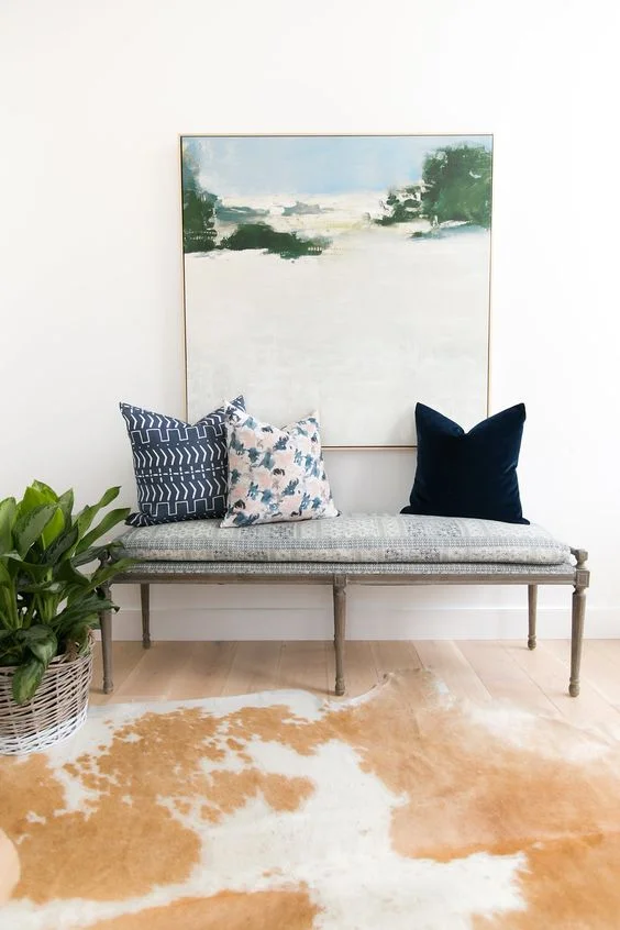 This style offers a nice place to sit while putting on or taking off your shoes. We like to keep the styling simple by pairing a unique bench with a large mirror or art piece that matches your personality. We suggest adding a pretty rug, a plant in a fun pot and a couple pillows for extra comfort.
