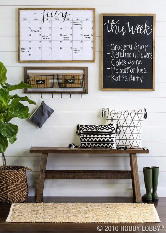 We always seem to be on the go these days. You can make the most of even small spaces with a home command center. Pair a reusable calendar with a small bench. Add in a memo board for writing important messages, like your grocery list or game times. We suggest using a basket for mail and papers coming in and out. We love this build your own wall organizer set here.